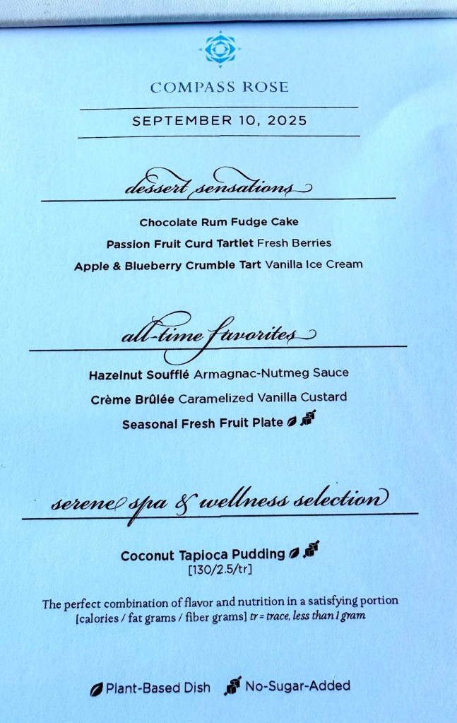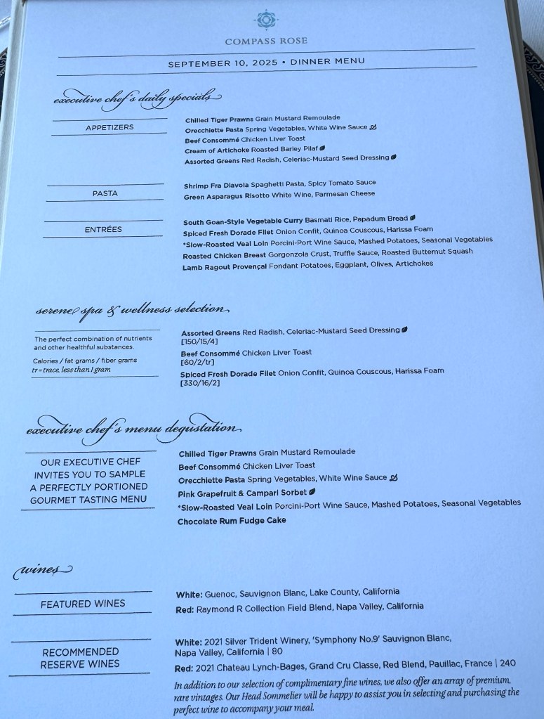 Hi Again All! Yep, we had another great night on our favorite Regent ship (even if we can’t have our favorite Cruise Director!). We started with dinner at our favorite Main Dining room on the high seas, Compass Rose.