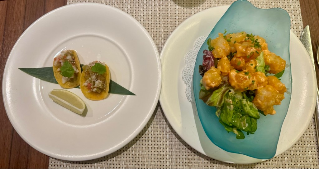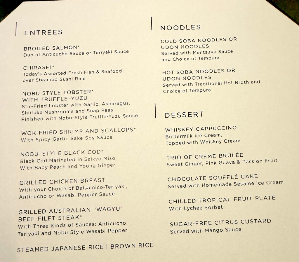 Hi Again All! Another serene day on Serenity! We had dinner tonight at one of their specialty restaurants called Umi Uma. It was created by legendary Master Chef Nobuyuki (Nobu) Matsuhisa and their dishes are inspired by the exotic array and traditions of the Orient. Nobu is a Michelin starred chef and Crystal has the only Michelin starred restaurant at sea. WOW… the food was amazing!