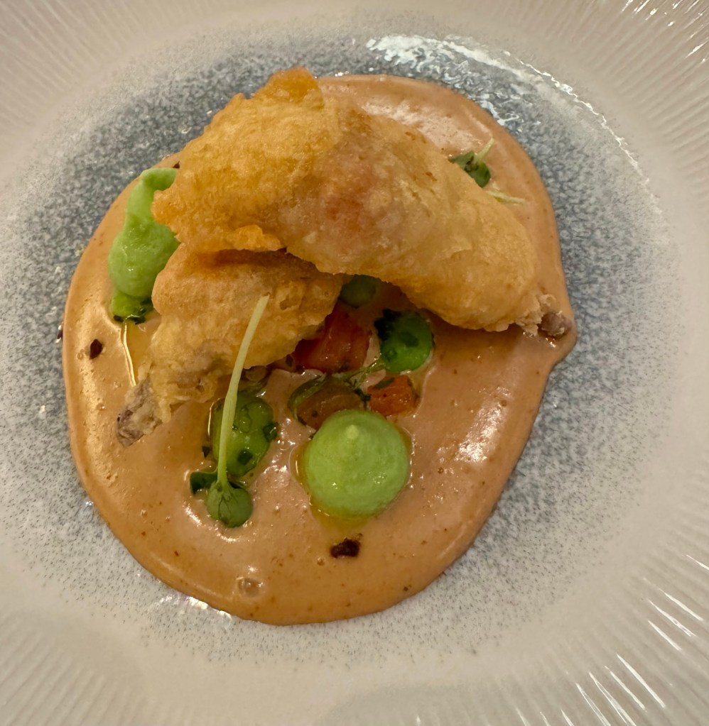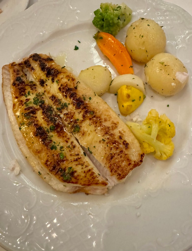 Hi Again Gang! Tonight we were back at the Main Dining Room, Waterside, for dinner. They had a lot of good choices so it was hard to narrow it down. But I had the Octopus Carpaccio & Lobster Medallion and the Quail Tempura for my two starters and Dover Sole for my main. Believe it or not, I didn’t have dessert! But we had snuck some chocolate goodies from the buffet earlier that we had for a late night snack!