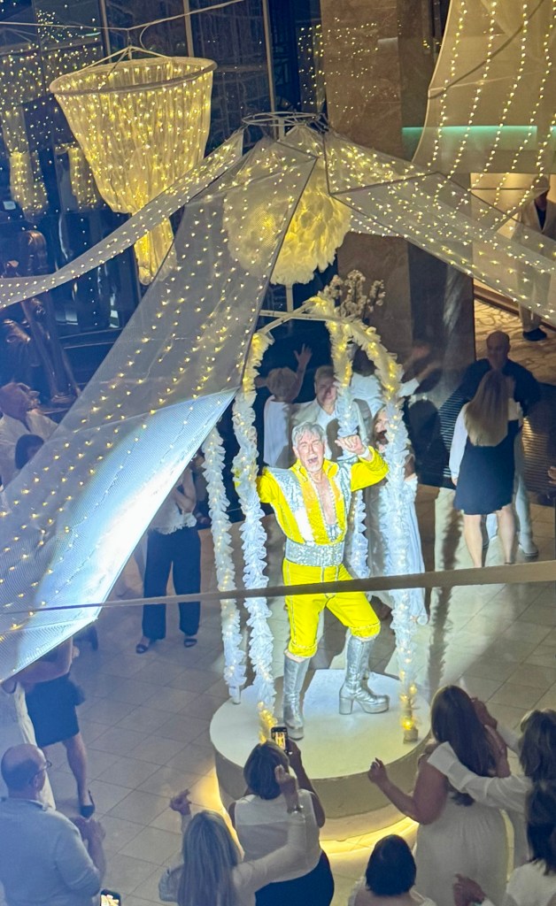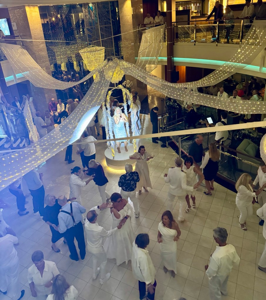 It features the Crystal Showband along with a violinist, a vocalist and the dance duo. And the Cruise Director Russ dressed up in his ABBA outfit and sang several ABBA hits. He was a hoot! It was a fun event with lots of people dressed in white.