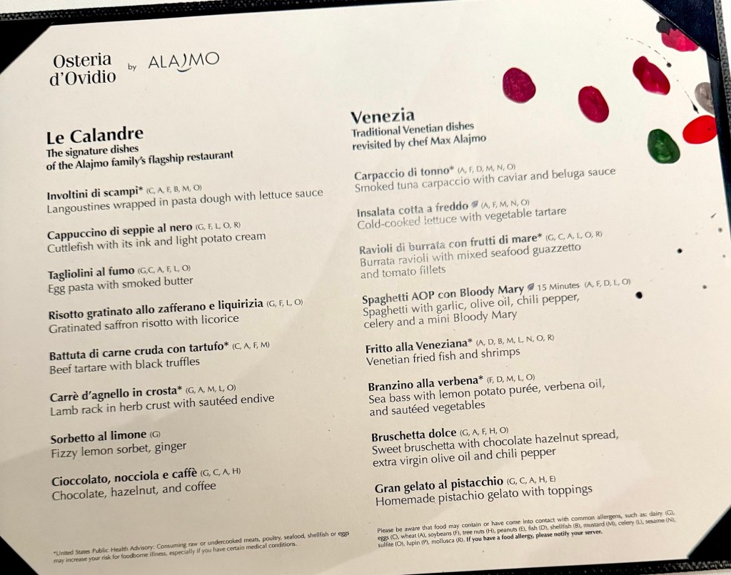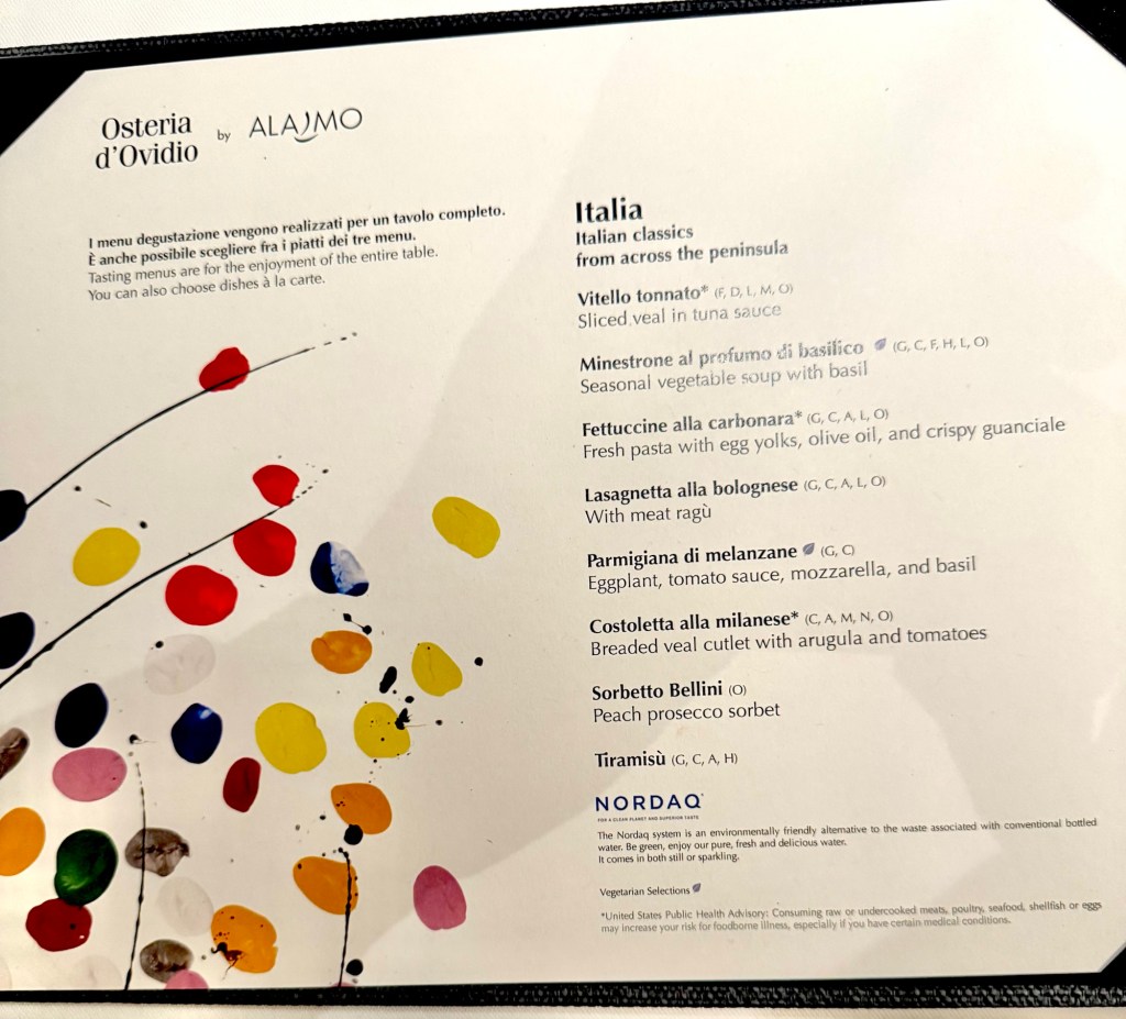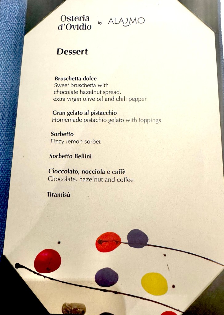 We had dinner tonight at the last specialty restaurant we haven’t been to called Osteria d’Ovidio. It is fairly new on Crystal and is Italian cuisine from the Michelin-rated Alajmo Brothers (Max and Raf. It was a huge menu and the food was amazing!