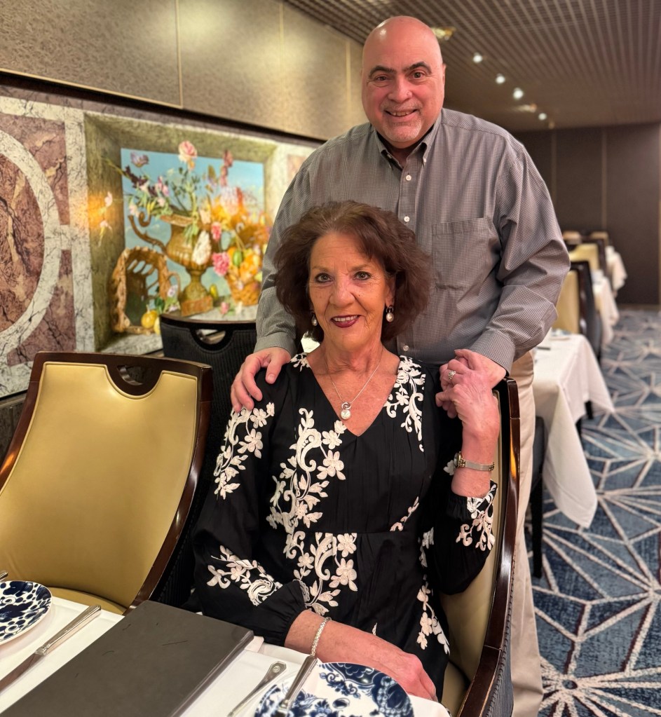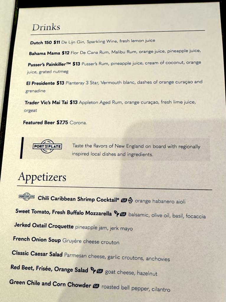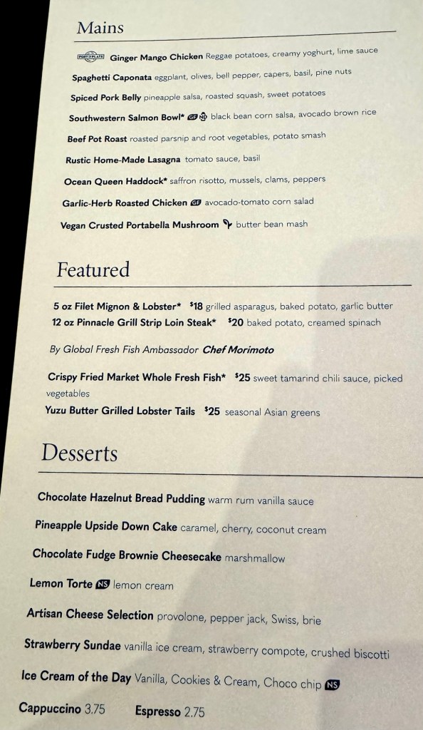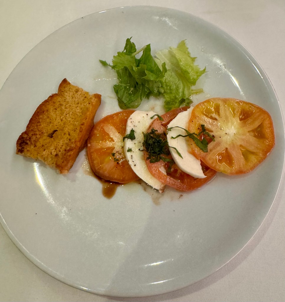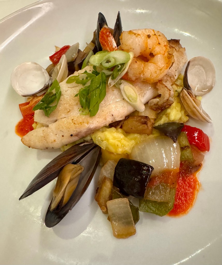 Hi Again Gang! We had a great first night on the ship. We had dinner at the Main Dining Room and the food was really good. I had the Tomato and Buffalo Mozzarella for my appetizer and the Haddock with Mussels, Clams and Risotto for my main. Sounds like something’s missing right?? We were still full from our late lunch so we had just one appetizer and no dessert. Heresy!