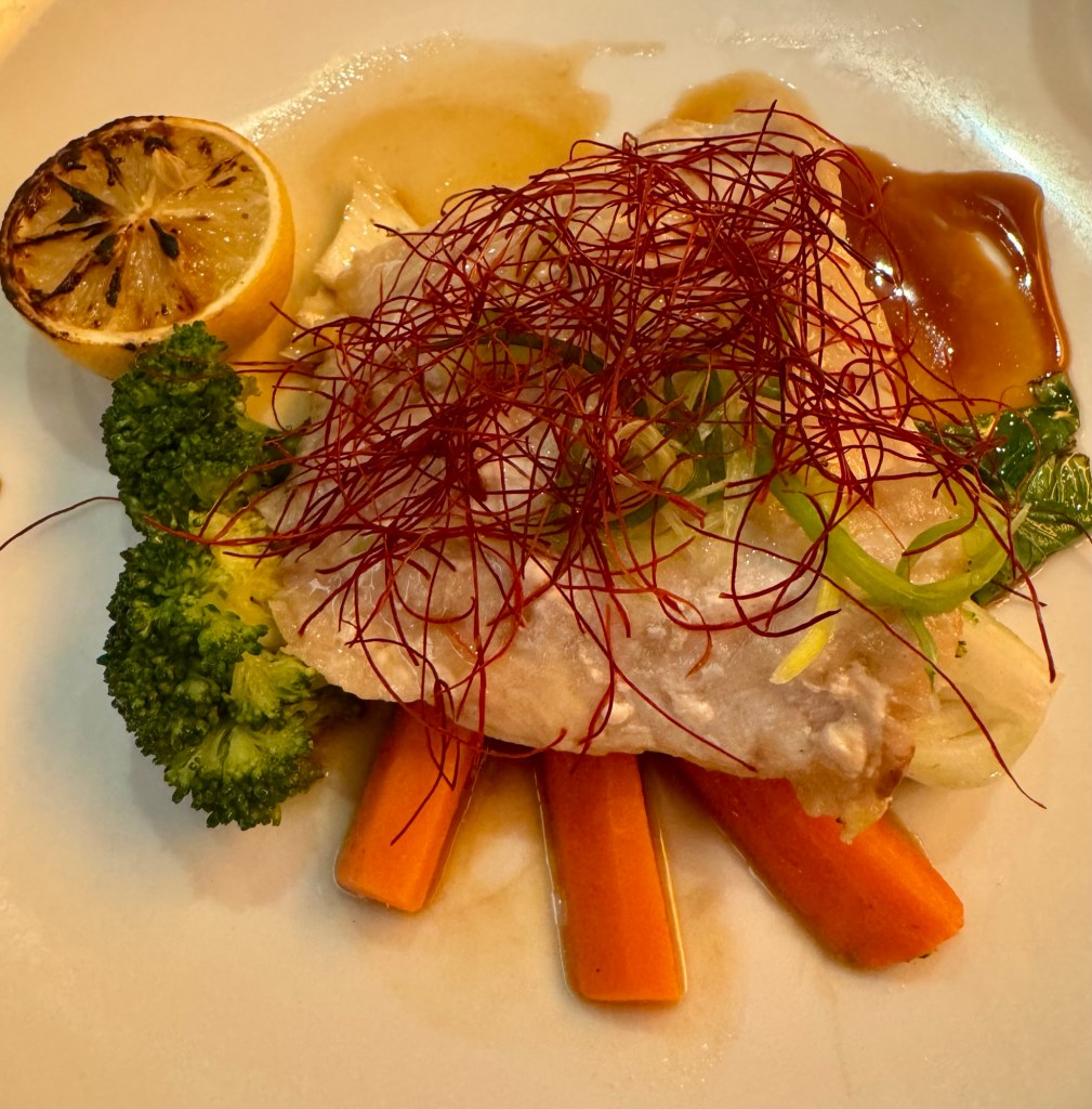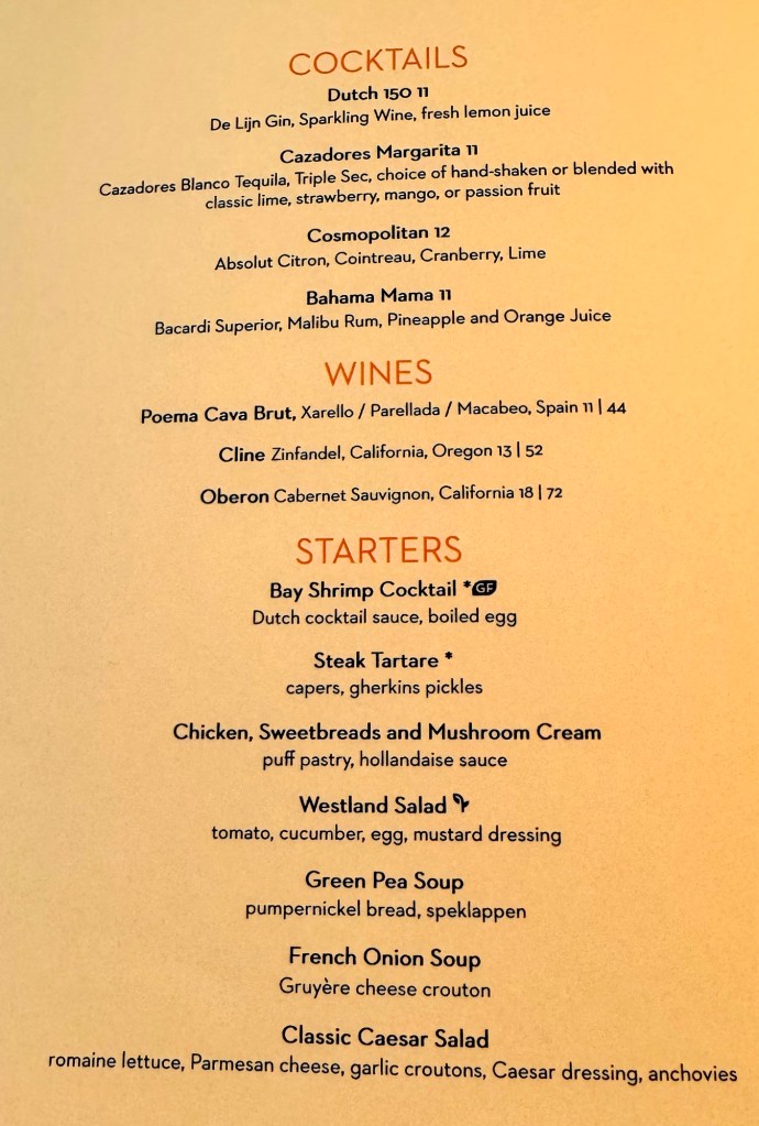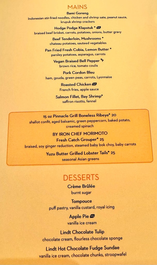 They also had some Dutch foods on the menu tonight. We ate in the main dining room and I started with the Green Pea Soup for my first appetizer and the Baby Shrimp Cocktail for my second appetizer. For my main I splurged and got the Fresh Caught Grouper from Iron Chef Morimoto. It was well worth it!