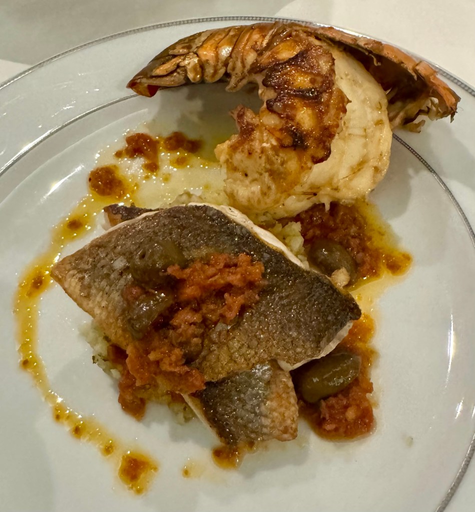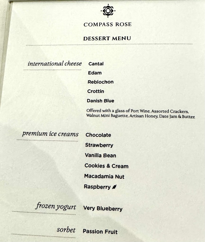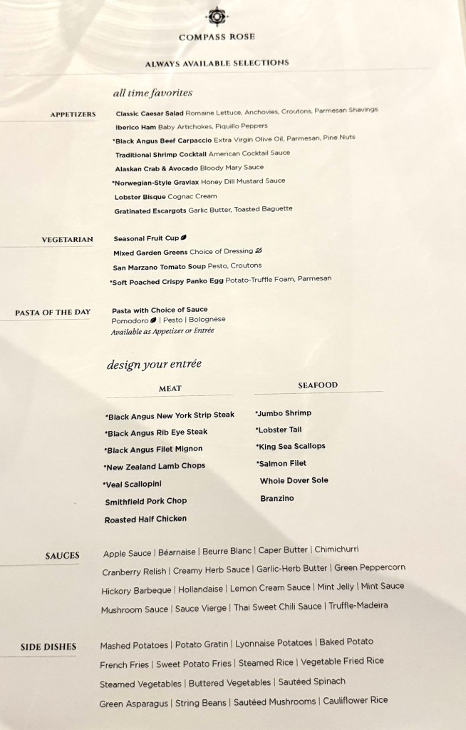 Hi Again All! We had another great evening (and we’re only on Day 2!). We had dinner at Compass Rose, their main dining room, which in my opinion is the best main dining room at sea. And we’ve been on almost every ultra luxury cruise lines out there. CR beats them all!Given we’ll be on here for 154 days I’m going to try my best to not order two appetizers every night and also (this is pure blasphemy!) not order dessert every night (of course unless it’s good chocolate!!). But then again, I could just cheat and not write about it if I did order dessert! Lol