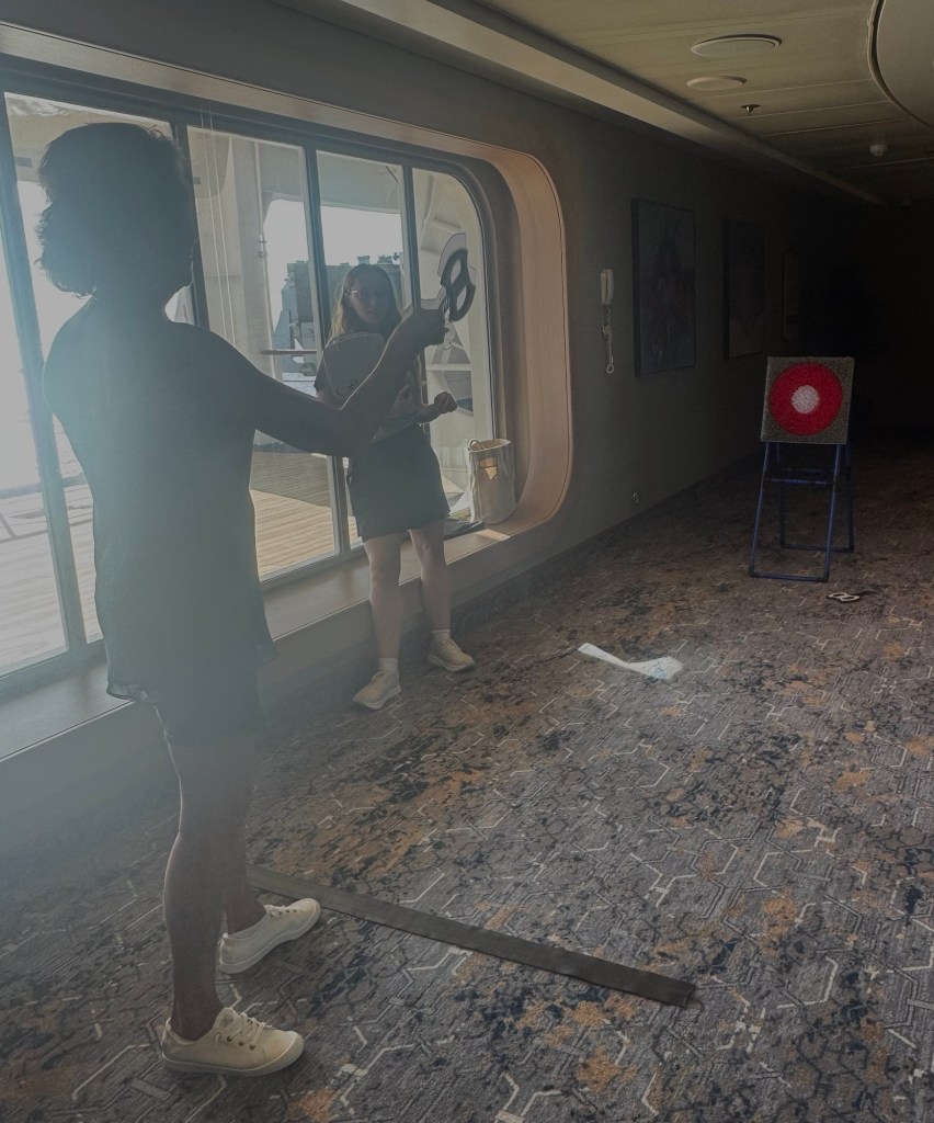 Hi All! We had a fun sea day! Slept in, hit the gym, had a light breakfast and started the day with a game against the other travelers! This one was ring toss (see the pic with Kathy’s great form!). And Kathy was so good she won us a Regent point!