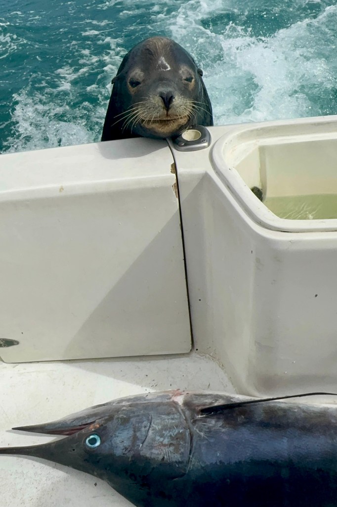 And then as we’re coming back into the port we got the cutest surprise of all. This sea lion literally hung on the back of our boat and was either trying to get our Marlin or some of the fish we had in an open container at the back of the boat for our bait. He was soooooo cute! I included a pic but the video was adorable. Wish we could have taken him home!