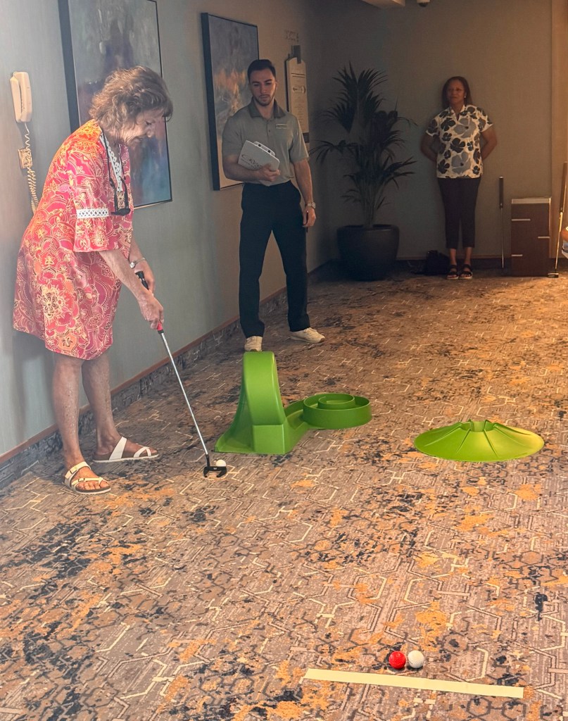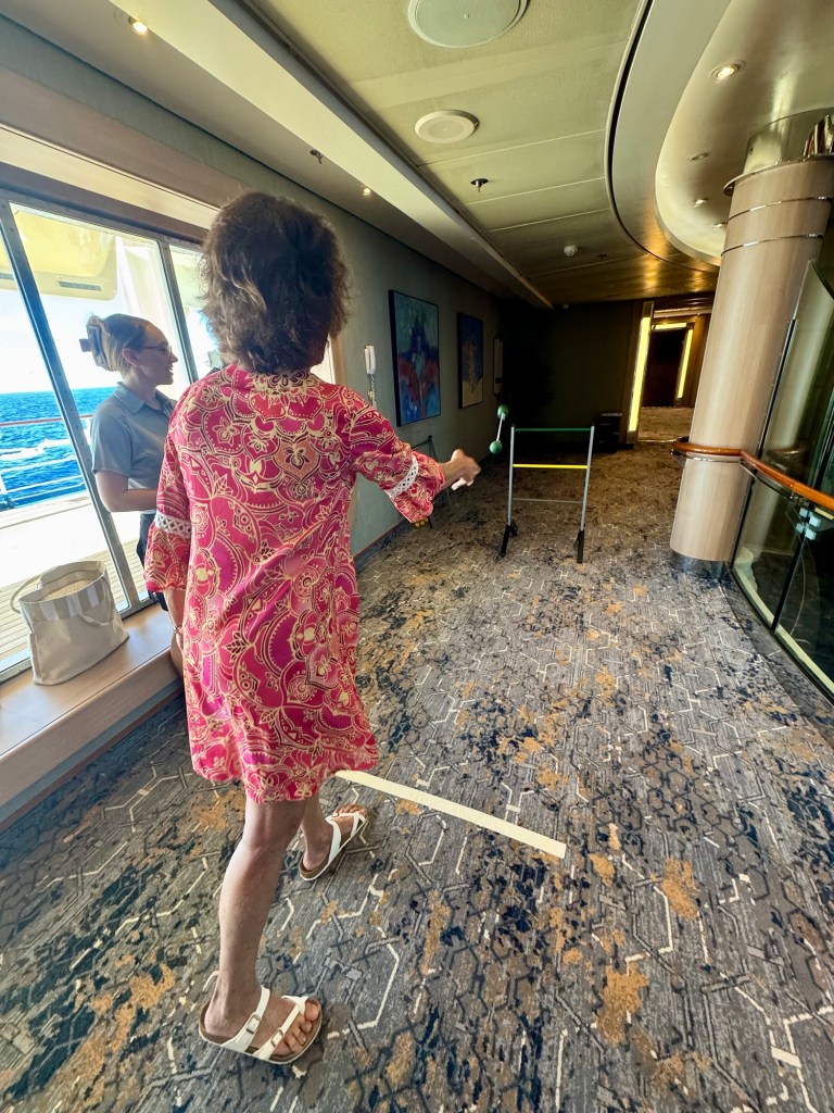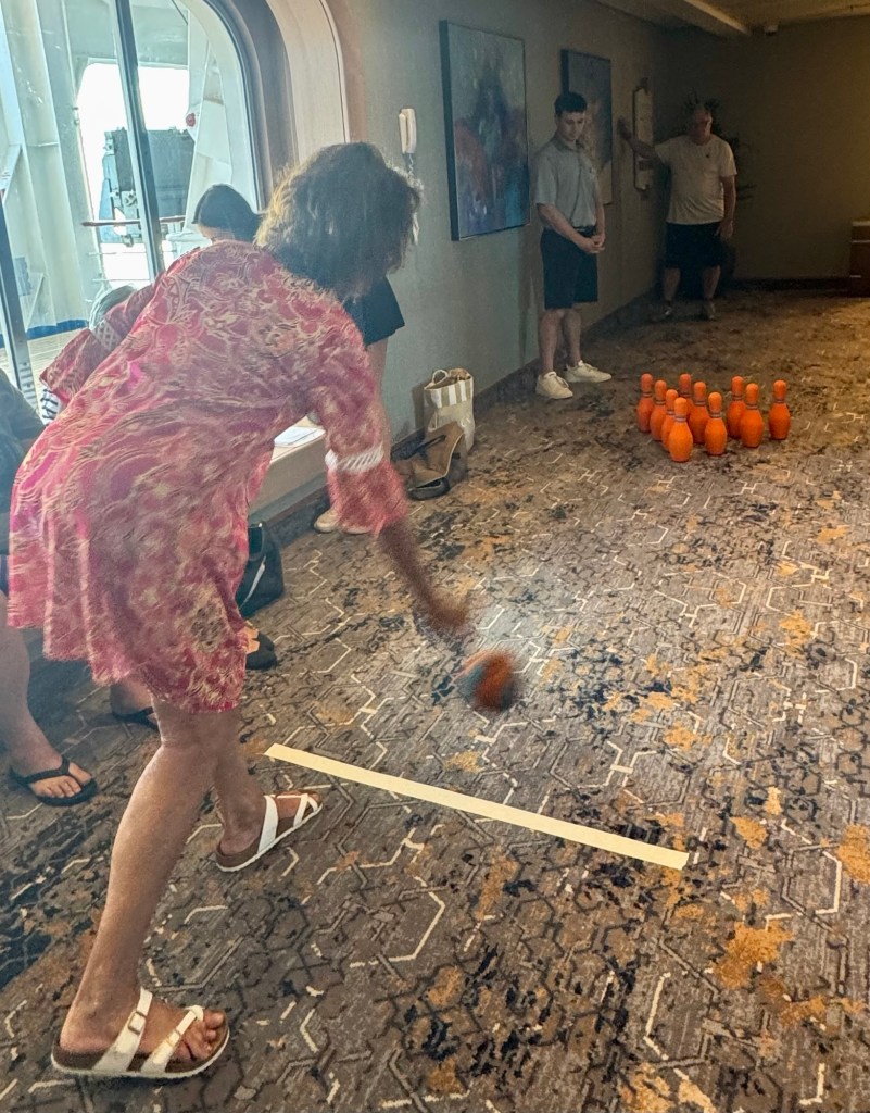 As for the passenger games, we played Top Toss, Skii Ball (against the Officers), Skittles and Crazy Golf. We won 7 Regent points (YAY!) and beat the Officers (Double YAY!). So across all games against the officers, we tied 5-5. Since we have no more sea days until our next segment starting in Honolulu (with 400 people getting off and 400 new ones getting on) we’ll start up a new set of games against the Officers then.
