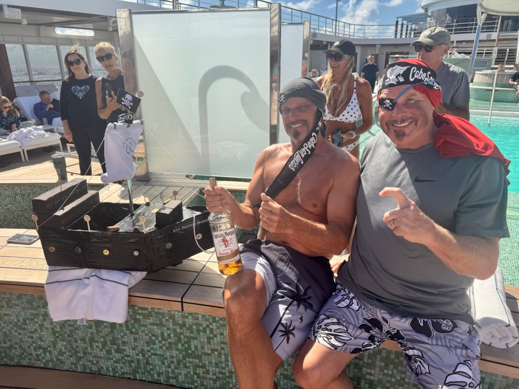 After lunch we watched the boat building competition. There were two groups who entered boats they made from gathering materials around the ship. Both boats were very creative and we were rooting for our good friend Christy, who we play the passenger games with, to win but she didn’t. Her competition was this huge pirate ship that was very impressive!
