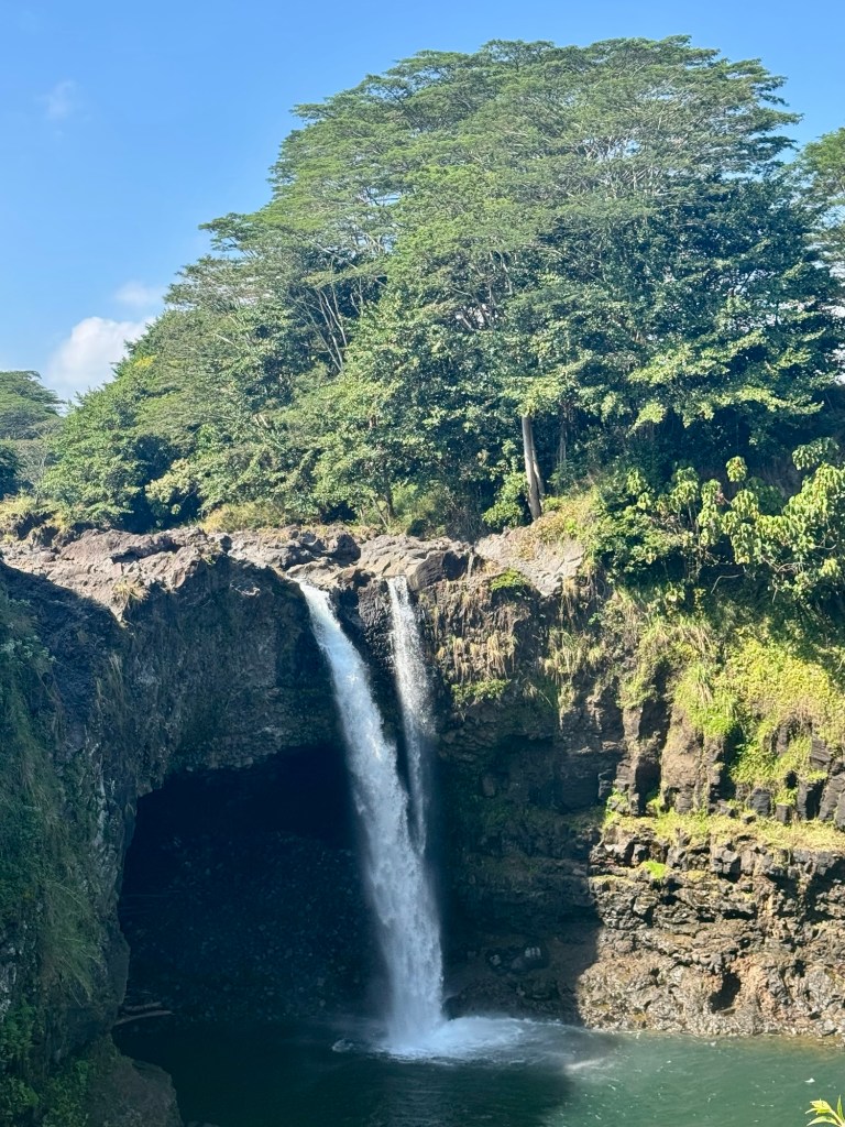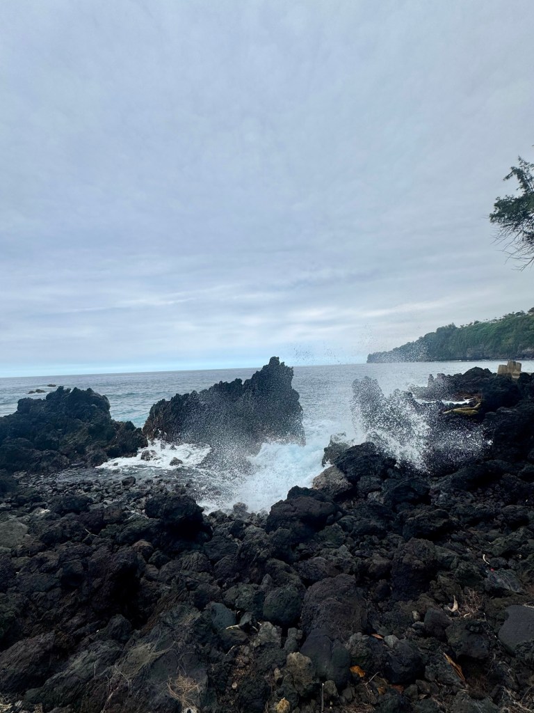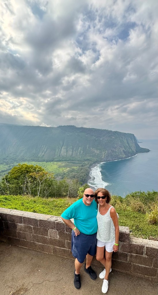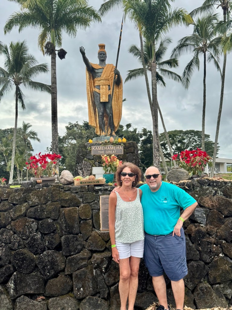We got to visit two waterfalls, Rainbow Falls and Akaka Falls. We also stopped at the Waipi’o Overlook to see the beautiful valley below and coastline. We went to Laupahoehoe Point with its rugged black sand/rock beach made from lava with the waves crashing in. We had a peaceful lunch there looking out over the water. We also stopped by the huge King Kamehameha Statue.