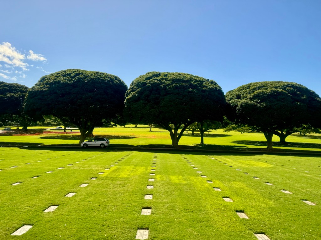 After our visit to the Memorial, we rode to Nu’ Uana Pali Lookout. We saw some amazing views down on to Honolulu as well as the surrounding mountain range and the Diamond Head Crater. We then road thru the National Memorial Cemetery of the Pacific (also known as Punchbowl Cemetery) which has over 61,000 graves.