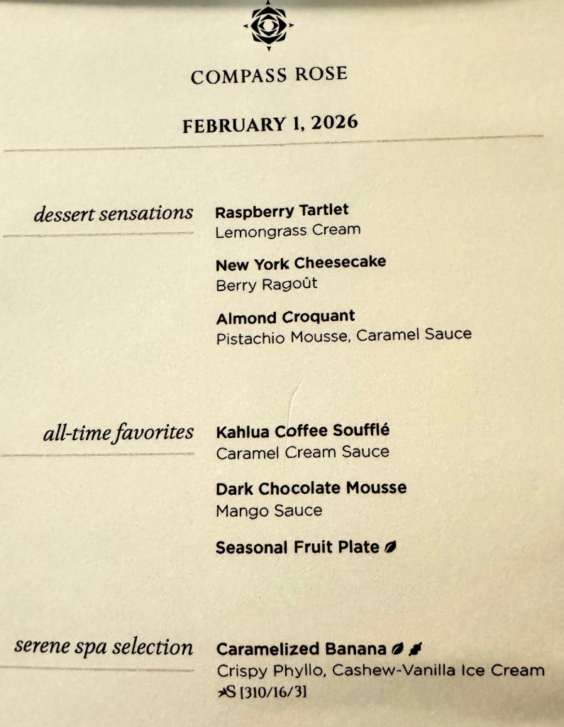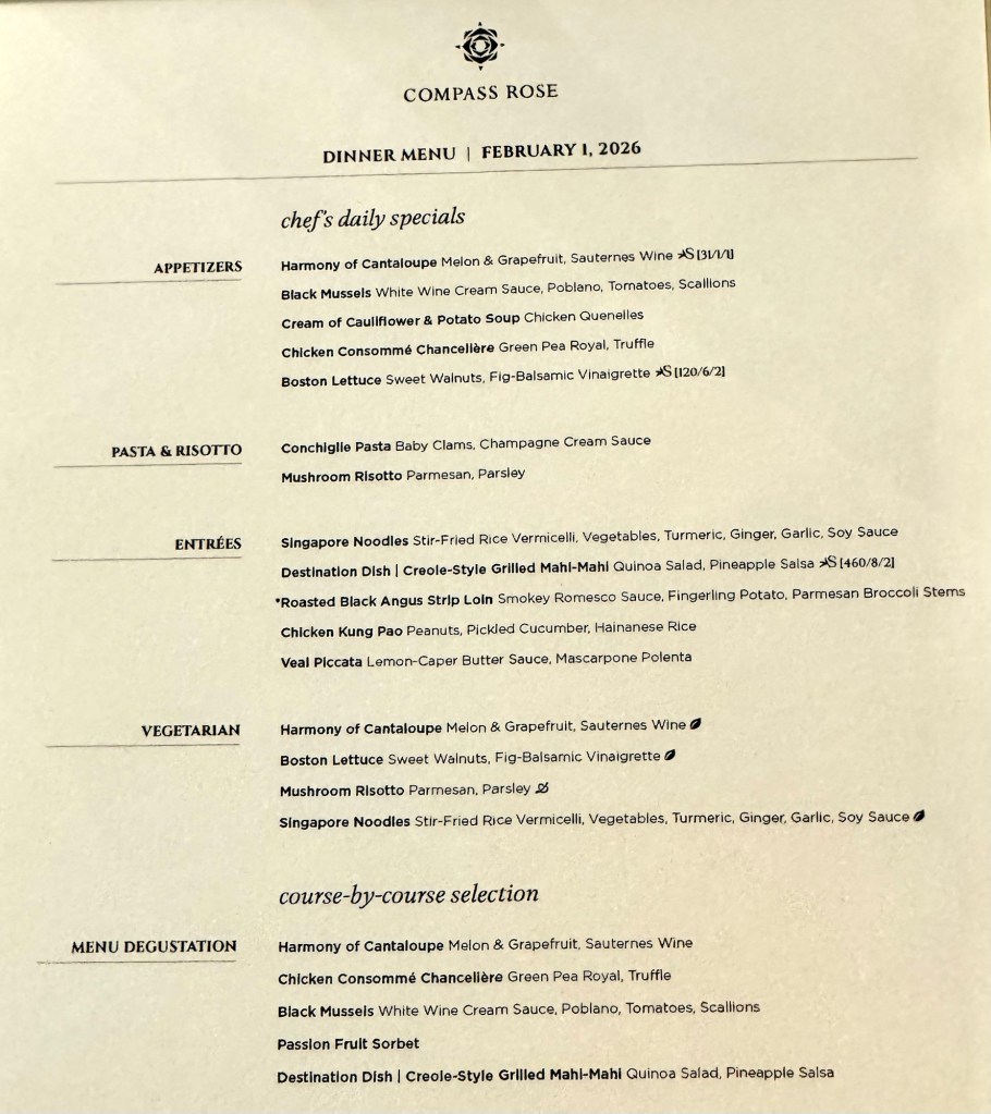 After the show we went to Compass Rose for dinner. We had missed our regular server Dennis since we hadn’t been there for a few days. He thought we left! Lol. I had the Cream of Cauliflower & Potato Soup as well as the Mushroom Risotto for my starters. And the Creole-Style Grilled Mahi-Mahi for my main. For dessert I had the Kahlua Coffee Soufflé. All extra yummy!