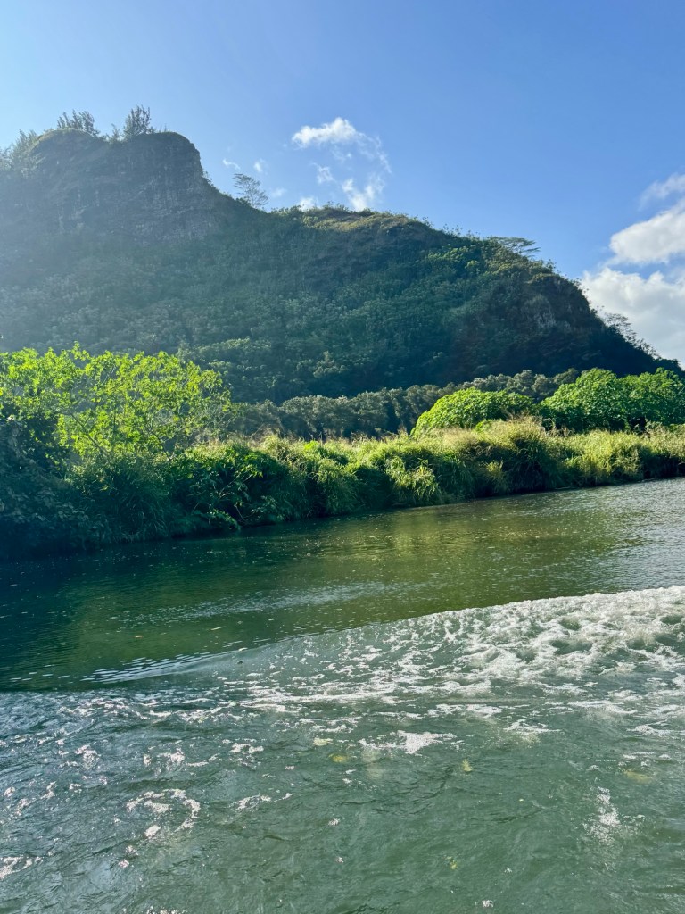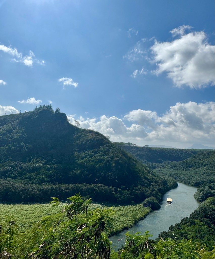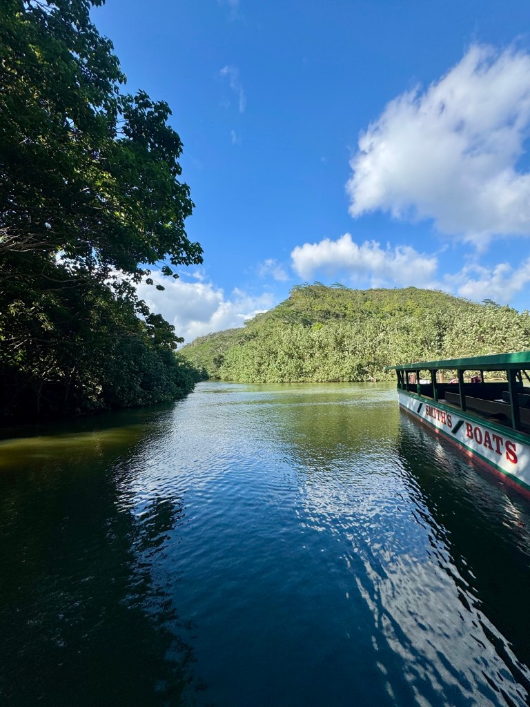 Our excursion today was a river cruise down the Wailua River to a place called Fern Grotto. I know, you’re thinking we’ve been on a cruise for 24 days, we got off and got on a different cruise? Well it was a really cool experience floating down this river where they filmed parts of Raiders of the Lost Ark. We saw the rope swing where he swung out onto the river!