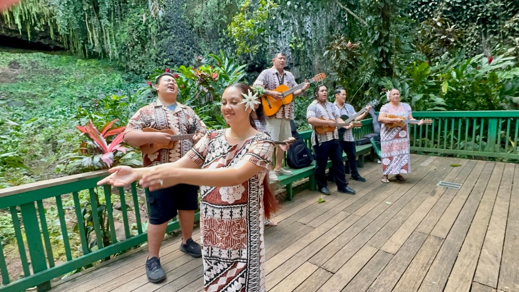As we floated down the river, they played and sang Hawaiin music and taught us to do the hula dance (I didn’t film that!). When we got to Ferm Grotto they played more Hawaiin music. Fern Grotto is a natural lava rock cave famous for its lush hanging ferns. It’s where many Hawaiin Royalty get married as well as many locals.