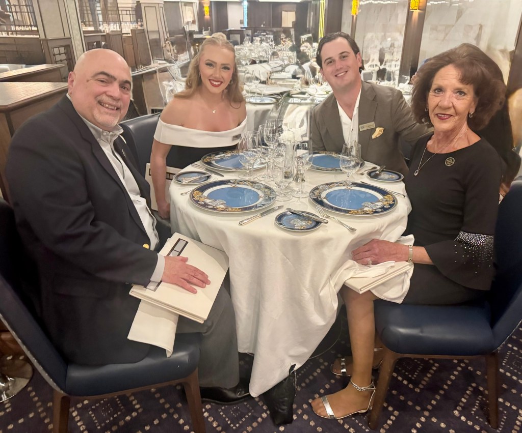 Hi Again All! Tonight was such a fun night! We got to have dinner with our two favorite singers from the Regent Production Company. Isma Kielty, from New Jersey and Lachlan Griffith, from Australia. They are two of the four primary singers. We’ve really gotten to know them well thru the passenger games since the various singers and dancers facilitate the games.