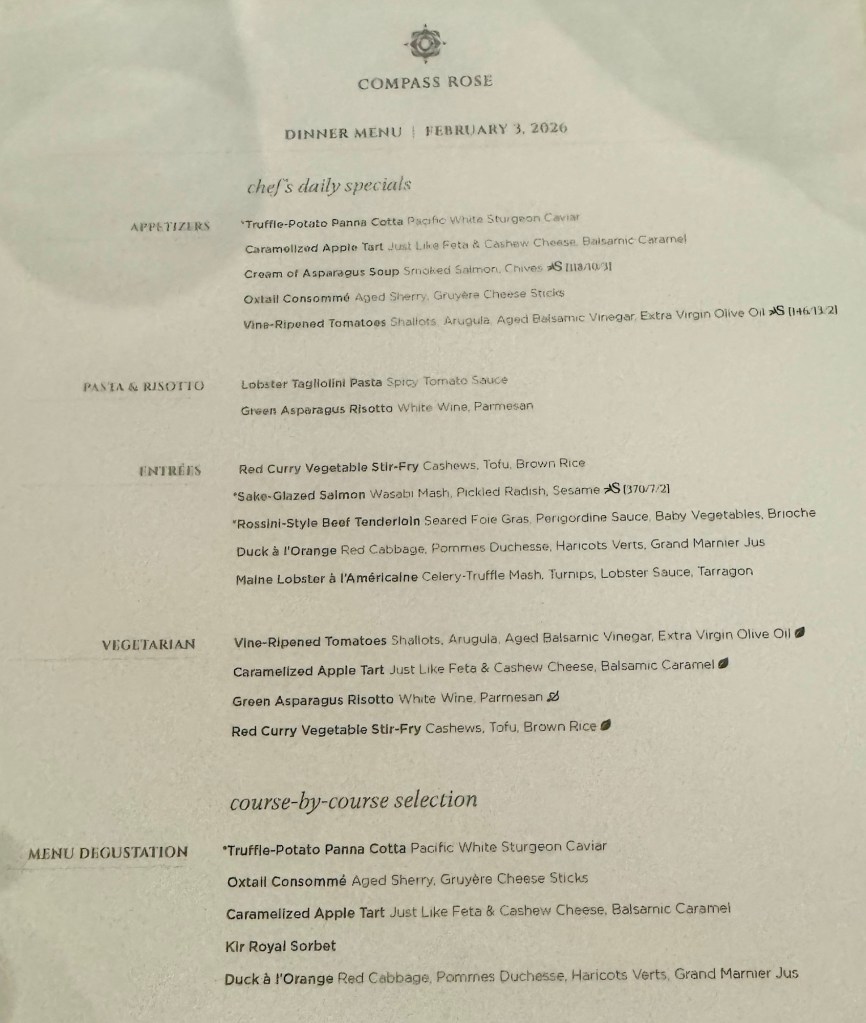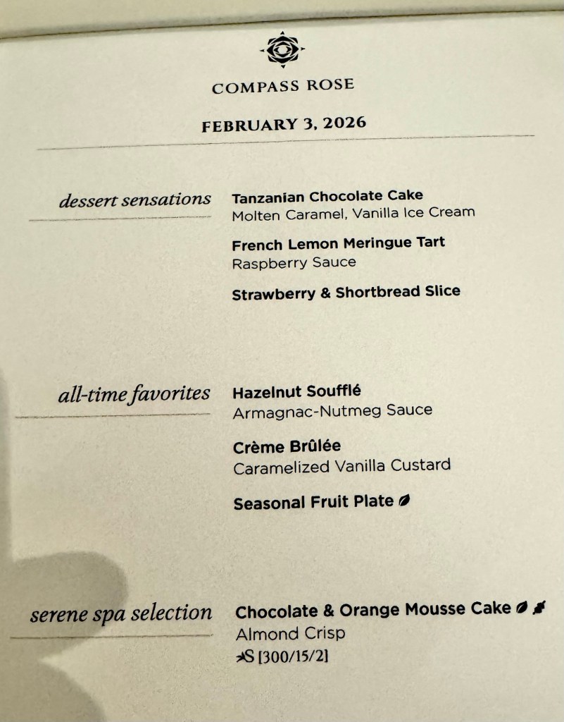 We had a great dinner at Compass Rose and learned so much about them both. They met on a cruise ship (they’re a couple!) and have worked on Norwegian, Oceania and Regent cruise ships. They fortunately get to work together for most of their assignments and they’ve been together almost 4 years (just like Kathy and I!). It was such a joy to have dinner with them and we hope to do it again!