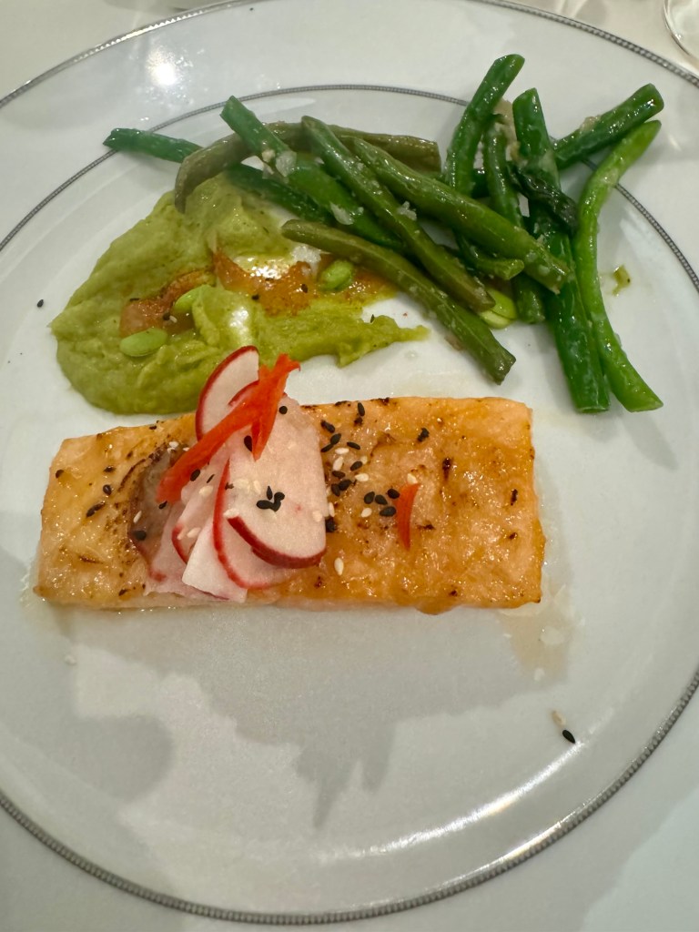 For dinner (they said it was OK to take pics!), I had the Cream of Asparagus Soup and the Asparagus Risotto for my two starters. I had the Sake Glazed Salmon for my main and for dessert I had the Tanzanian Chocolate Cake. As always, everything was perfectly prepared and delicious!