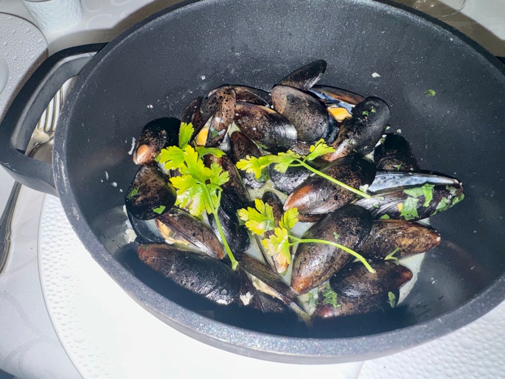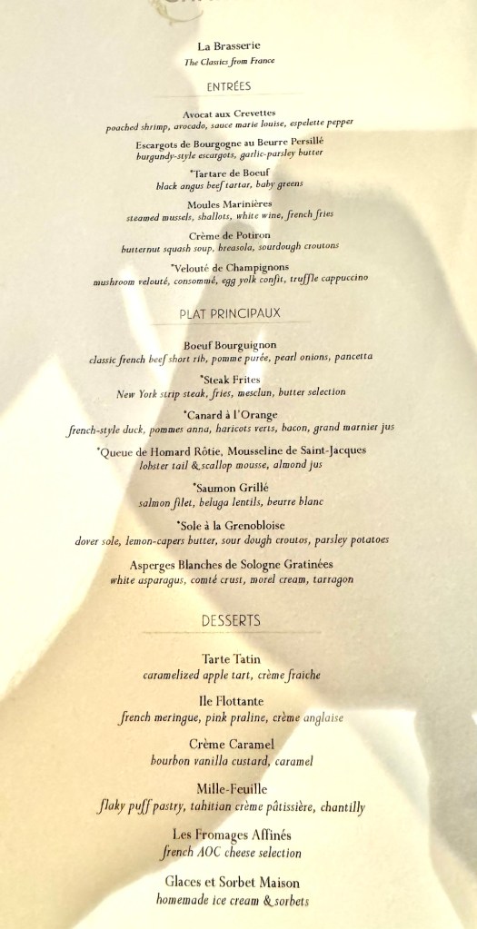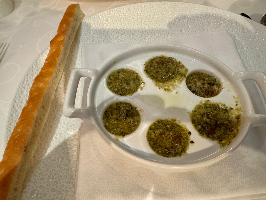Hi Again All! We had another great night. Started off with dinner at the French Specialty restaurant Chartreuse. I had the Escargot and the Mussels (Best ever!) for my starters and Beef Bourguignon for my main. For dessert I had the French Cheese plate. Once again, everything was delicious (especially the Mussels!!).