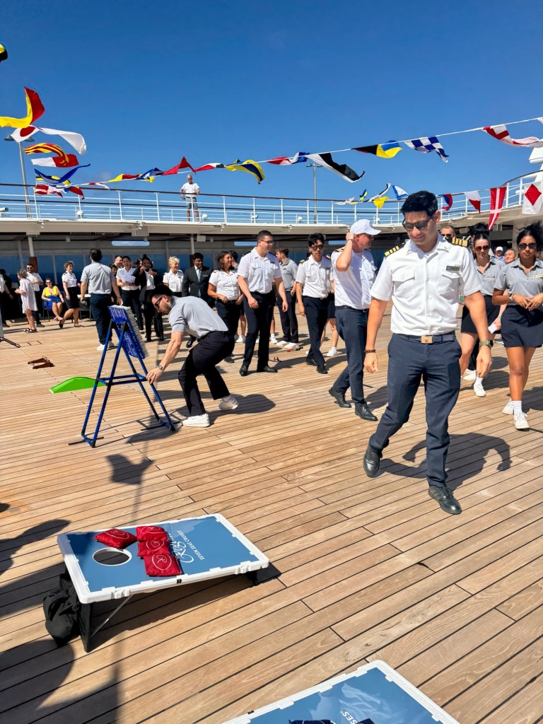 But today’s games were slightly different. Rather than the usual Officers challenge game indoors, they had “The Mariner Olympic Games” (a nod to the Winter Olympics!) outdoors. It started with the “Parade of Officers” marching in like all the nations do at the Opening Ceremonies of the Olympics. It was really fun and the Officers and the passengers tied!