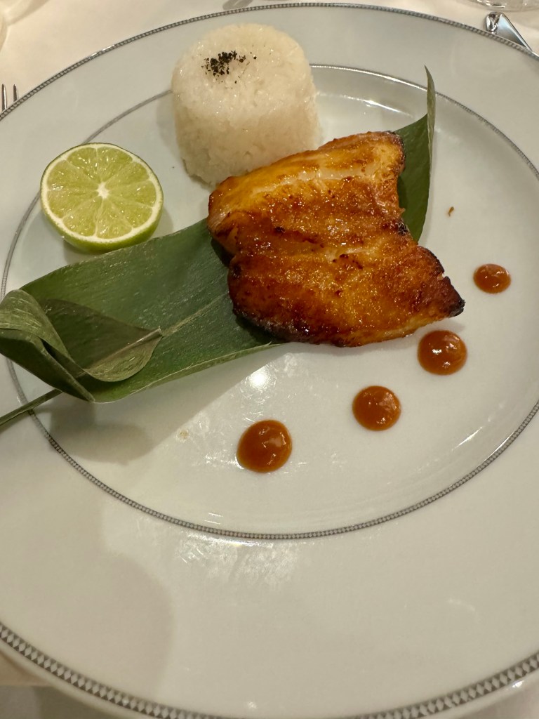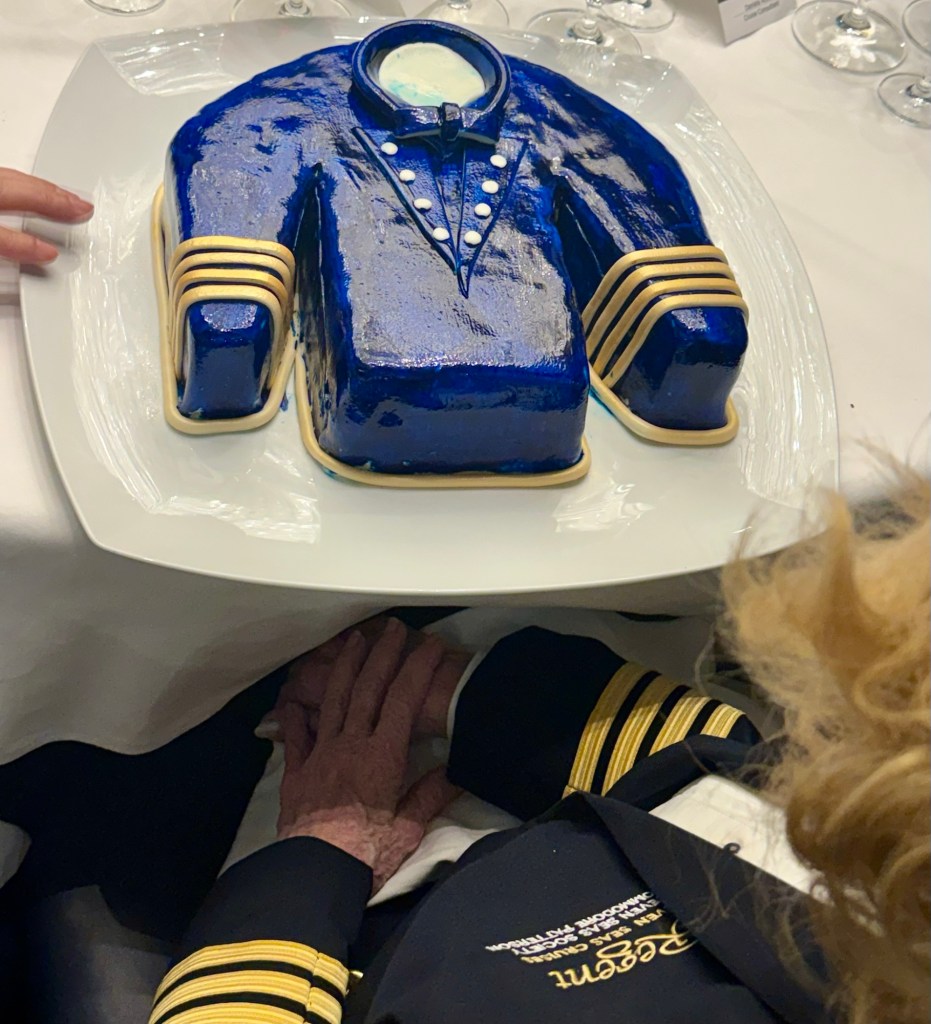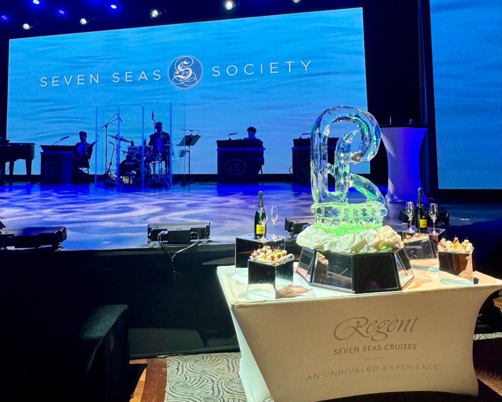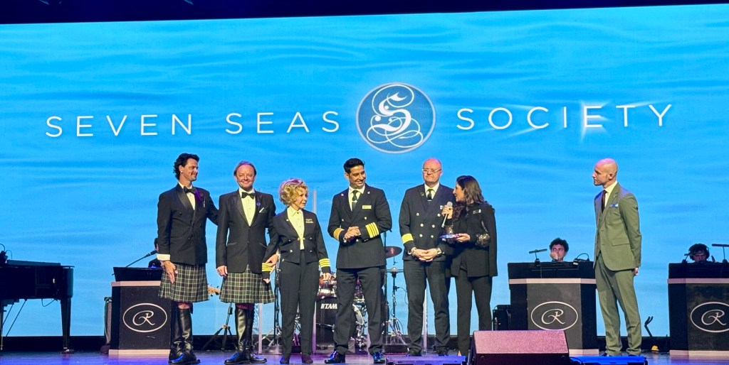 Before dinner they had the Regent Seven Seas Society party where they recognize all the various loyalty levels (we’re Platinum). They have lots of drinks and canapés and at the end the Regent singers put on a show. And they honored Sharon Patterson, with a Captain’s jacket, who reached the highest loyalty level of Commodore since she’s sailed with Regent over 2,000 nights!! That’s what Kathy and I are shooting for! Yeah, right! Lol