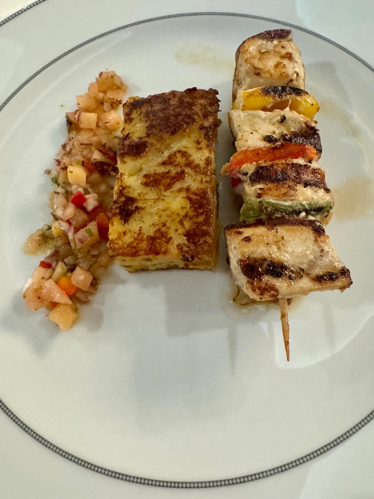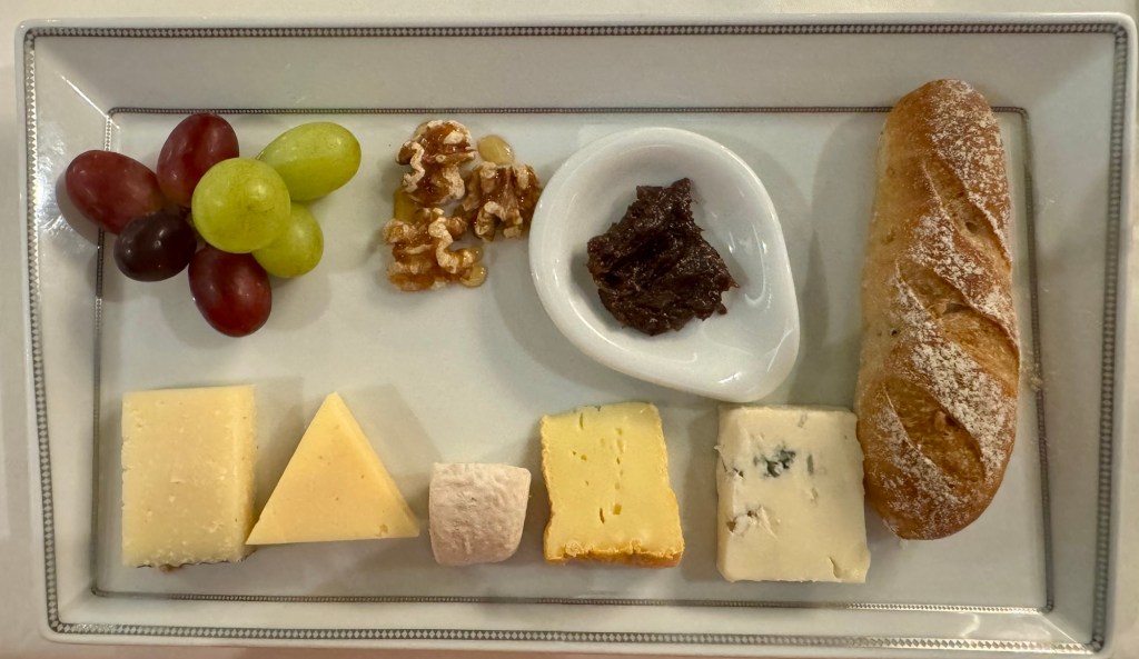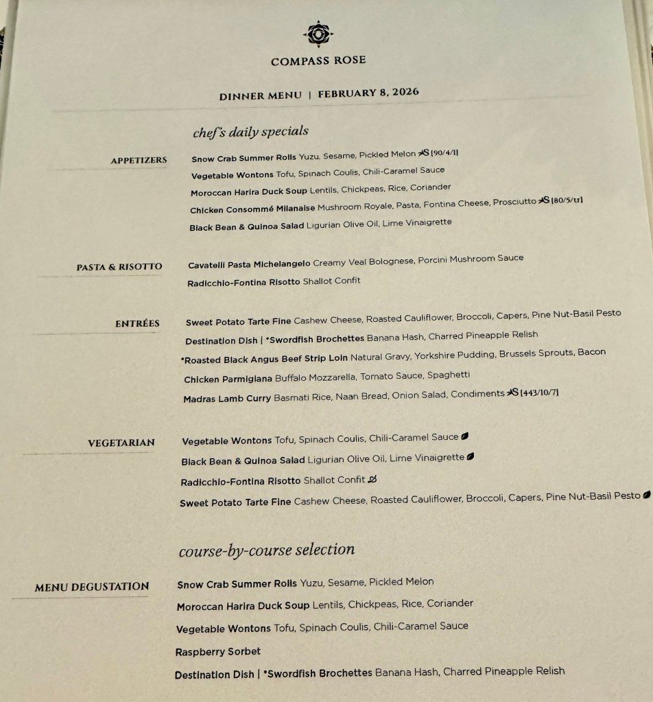 While we did eat a little junk food, with the time difference we ate at like 1 PM so as you know on cruise ships, you’re on two hour feedings! So of course we ate again around 7:30 PM. We went to Compass Rose but tried to eat lighter. I had the Snow Crab Summer Roll for my starter and the Swordfish for my main. For dessert I had the cheese plate.