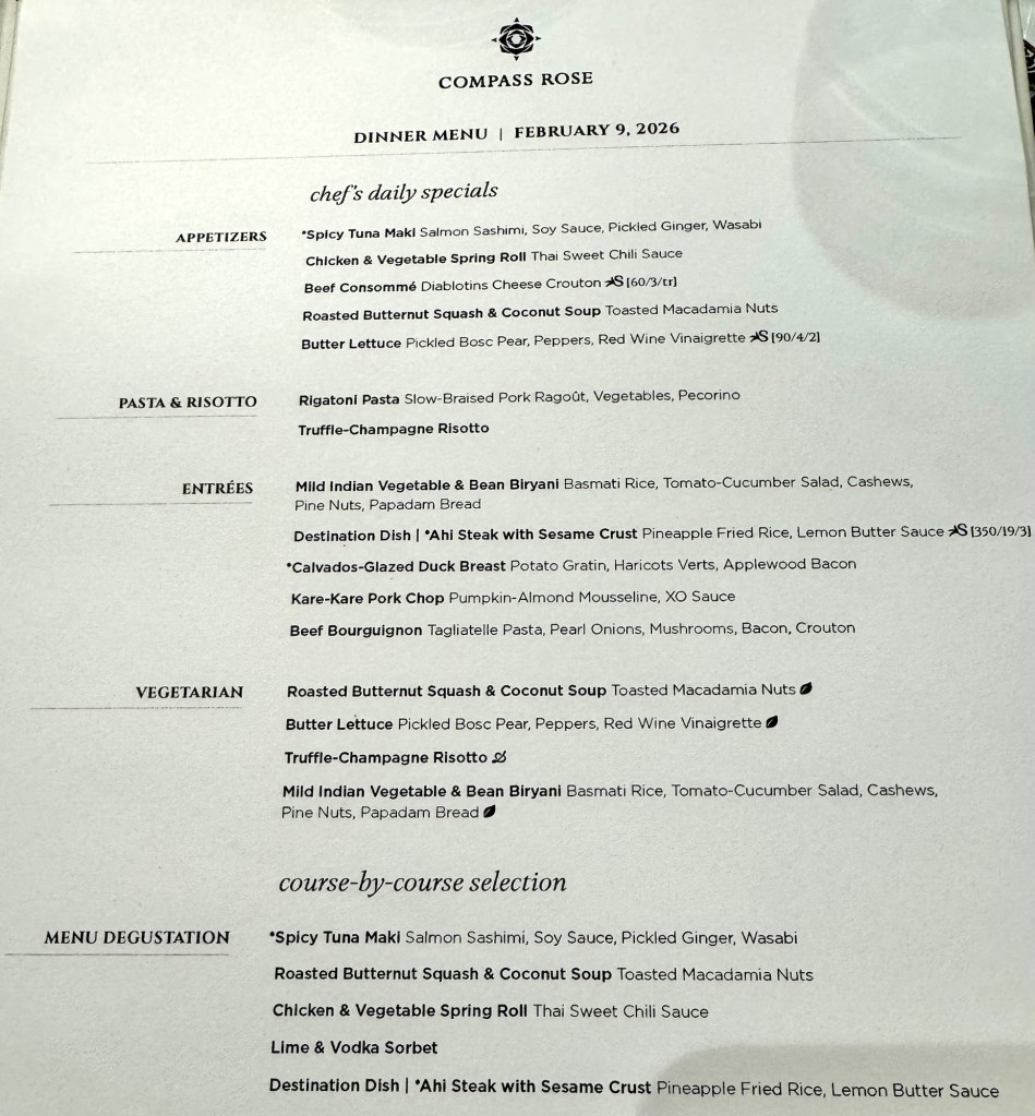 After that show we had dinner in Compass Rose with our next door neighbors, Aaron and Karen. They are from Oklahoma and are really nice people. Like us, they love to travel, so we both shared stories of all our travel adventures.