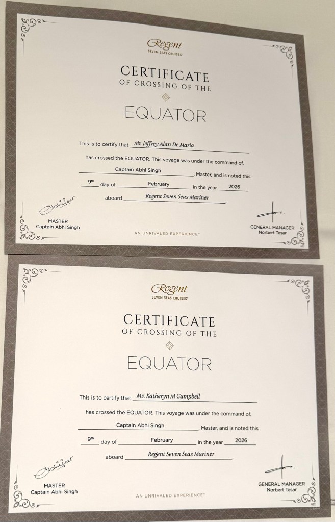After the show we called it a night and came back to our room to find our Crossing the Equator certificates. YAY! Hope everybody had a great Monday!