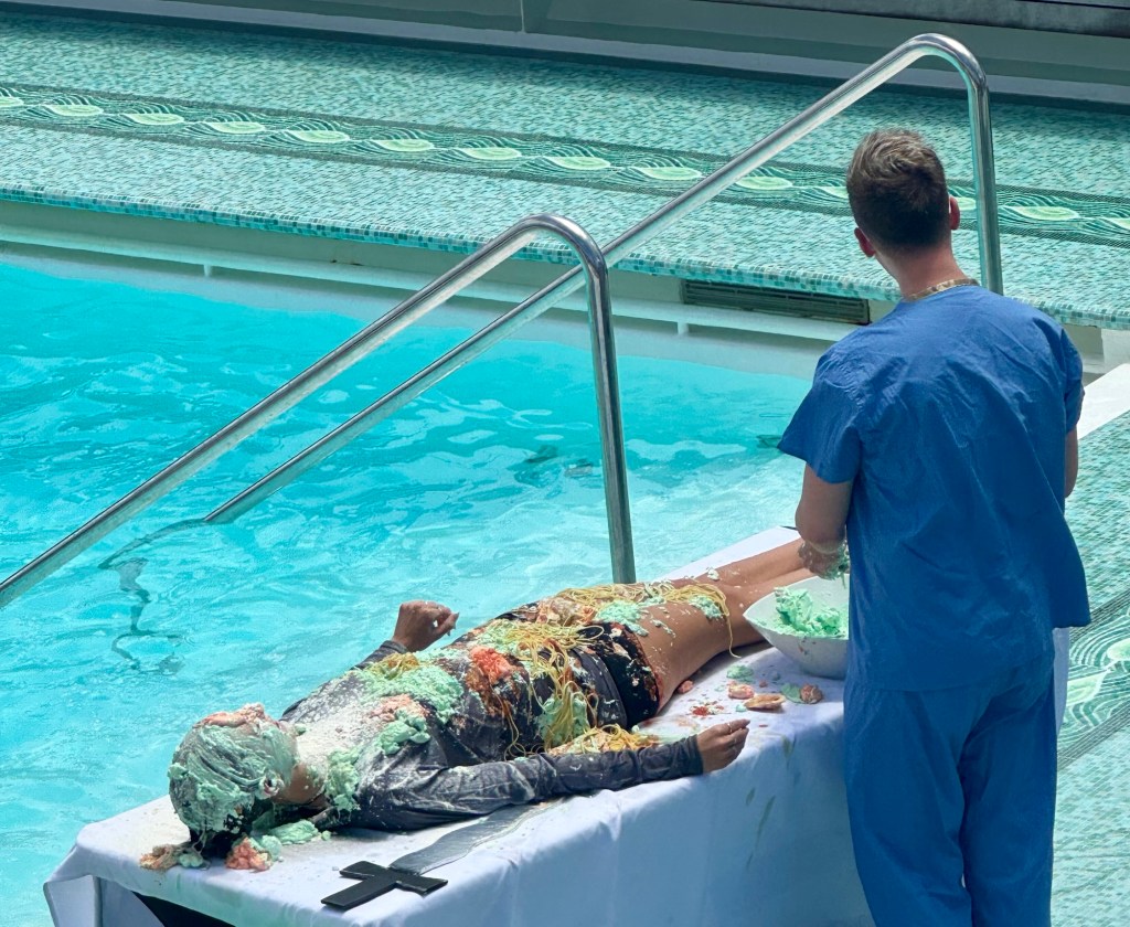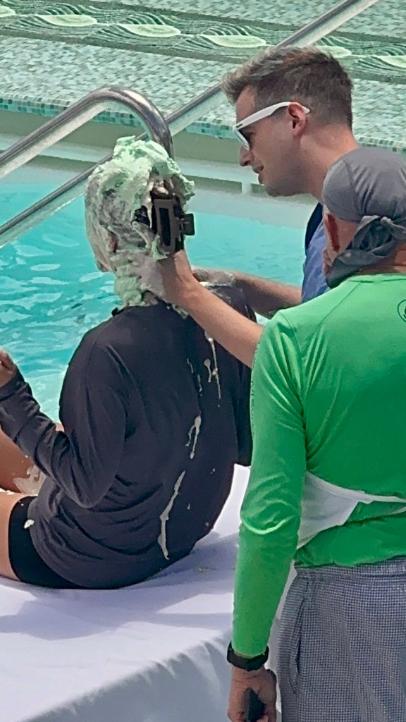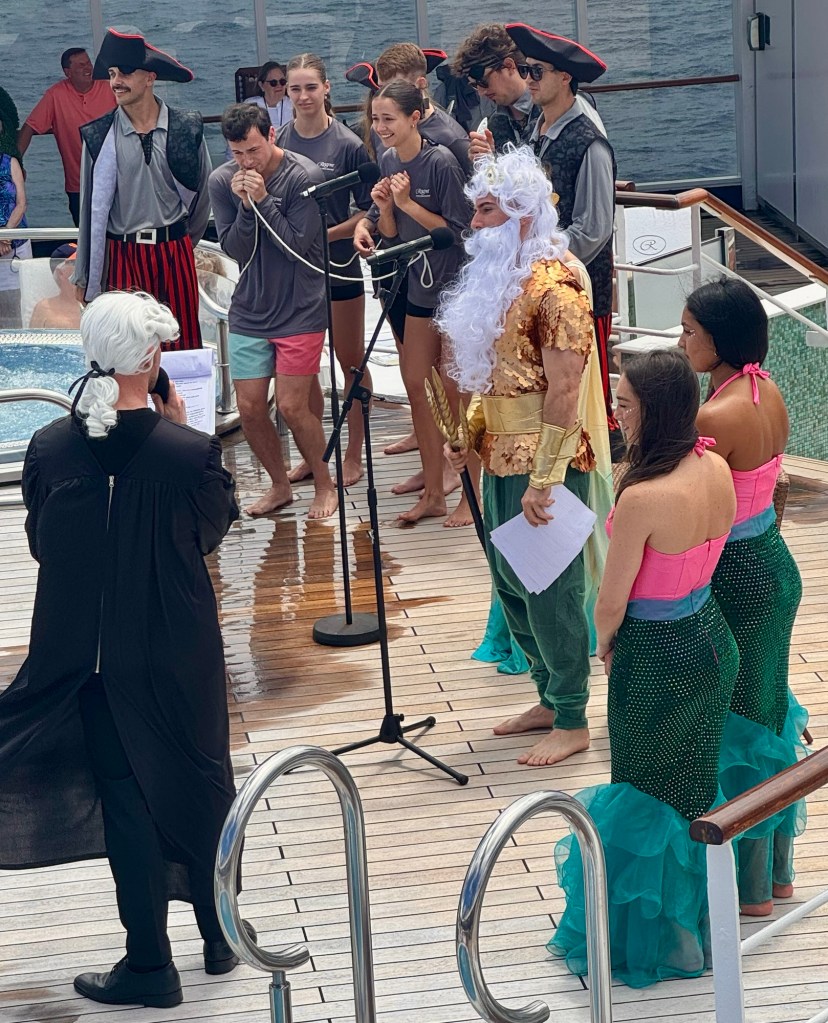 The other cool thing about today was we crossed the equator and had a ceremony by the pool deck to commemorate it. King Neptune himself showed up and converted the “poliwogs” (those who had never crossed the equator by boat) to a “shellback” a name for those who have crossed the equator by boat. It was a hilarious event since to “cross over”, you have to kiss a fish! Yuk!! But luckily Kathy and I crossed it last year on this same boat! And some of the crew that were polliwogs got “marinated” on their heads and bodies with all kinds of junk!