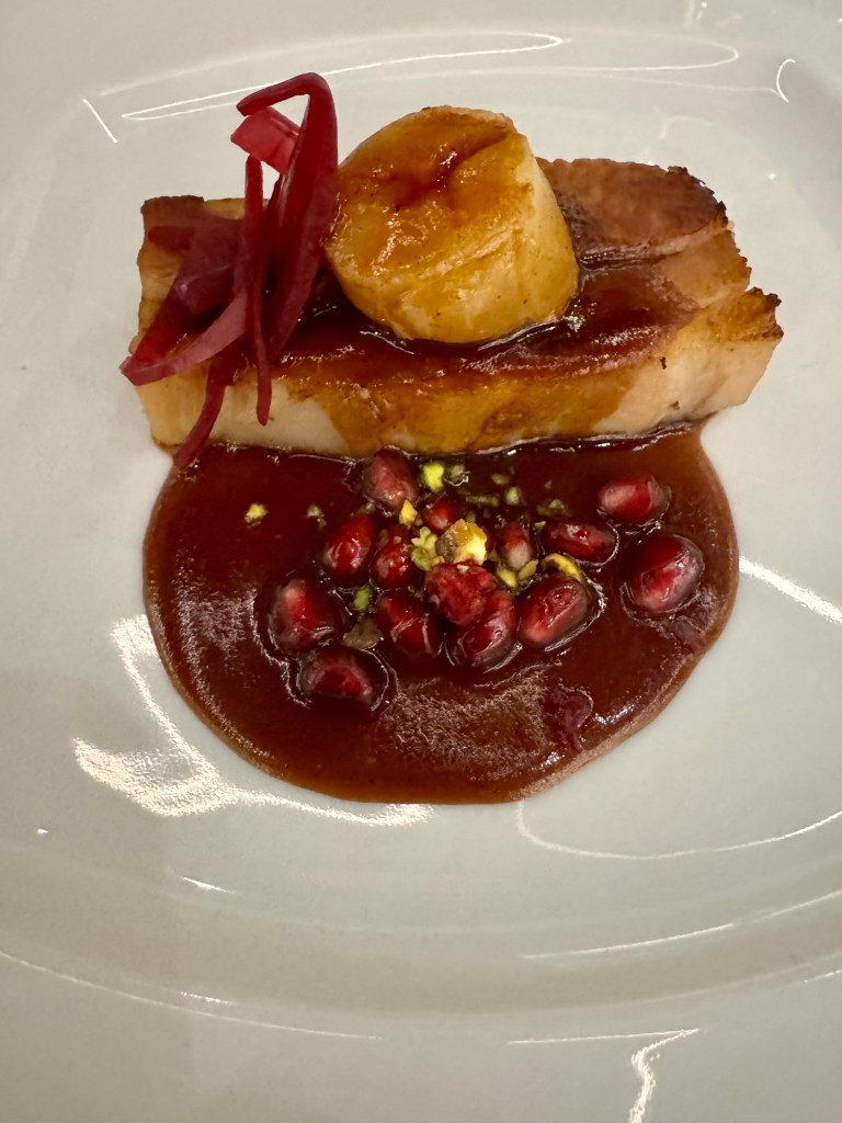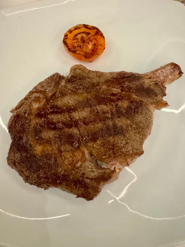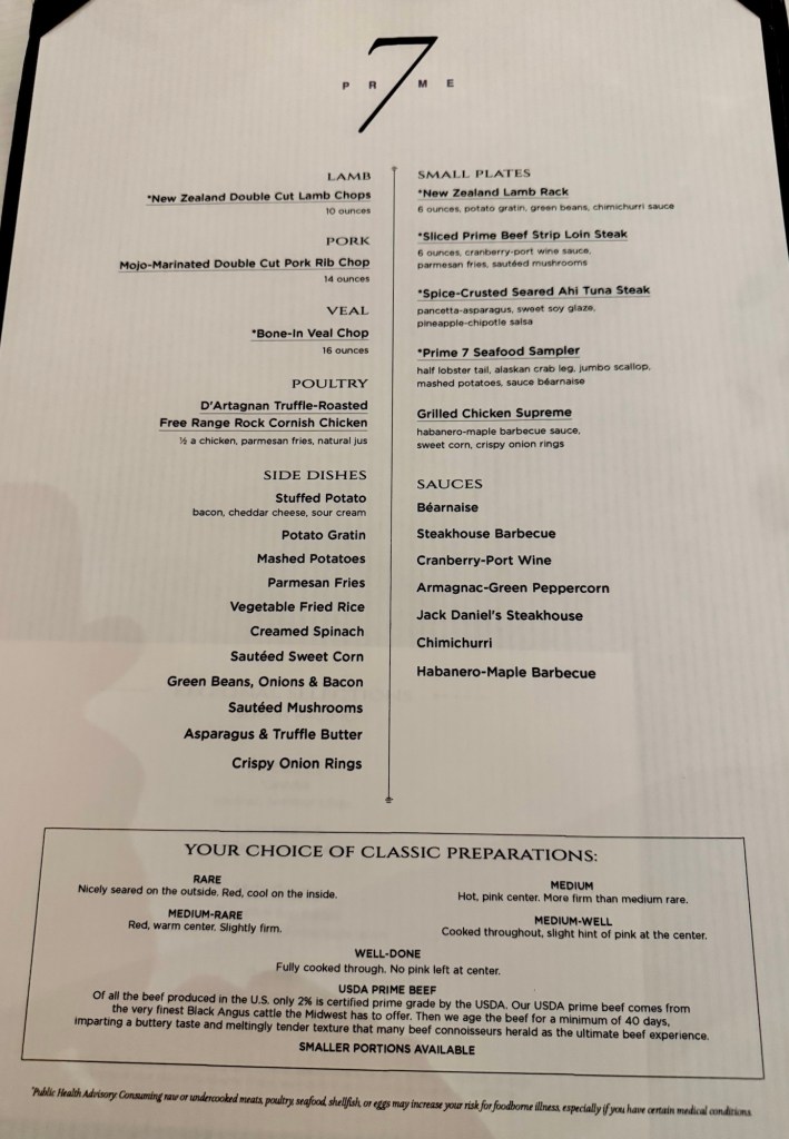 We had a very nice Valentine’s evening (Kathy looked amazing in her red dress!). We started off with a delicious dinner at the specialty restaurant, Prime 7. In my opinion, the best luxury steakhouse at sea. I had the crab cake and the seared diver scallop for my starters. I had been eating mostly fish each night so I decided to boost my iron levels and got the huge bone in ribeye. Wow, is that good eating! We were so stuffed and also wanted to make the show so we skipped dessert (can you believe it??).