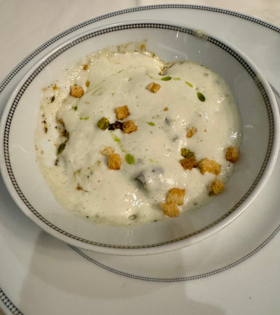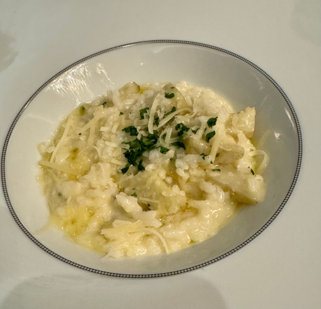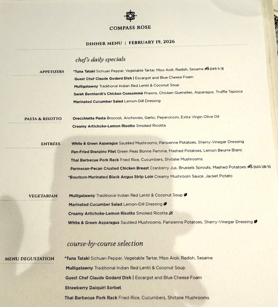 After that we went to dinner in Compass Rose. We had dinner again with our two favorite Regent singers, Isma and Lachlan. They are the nicest people! I got the special Escargot and the Risotto for my two appetizers and the Branzino Filet for my main. For dessert I had the special Chocolate Bombe.