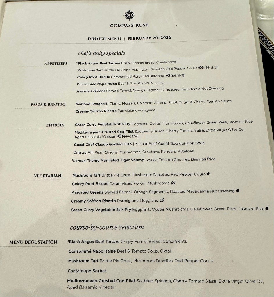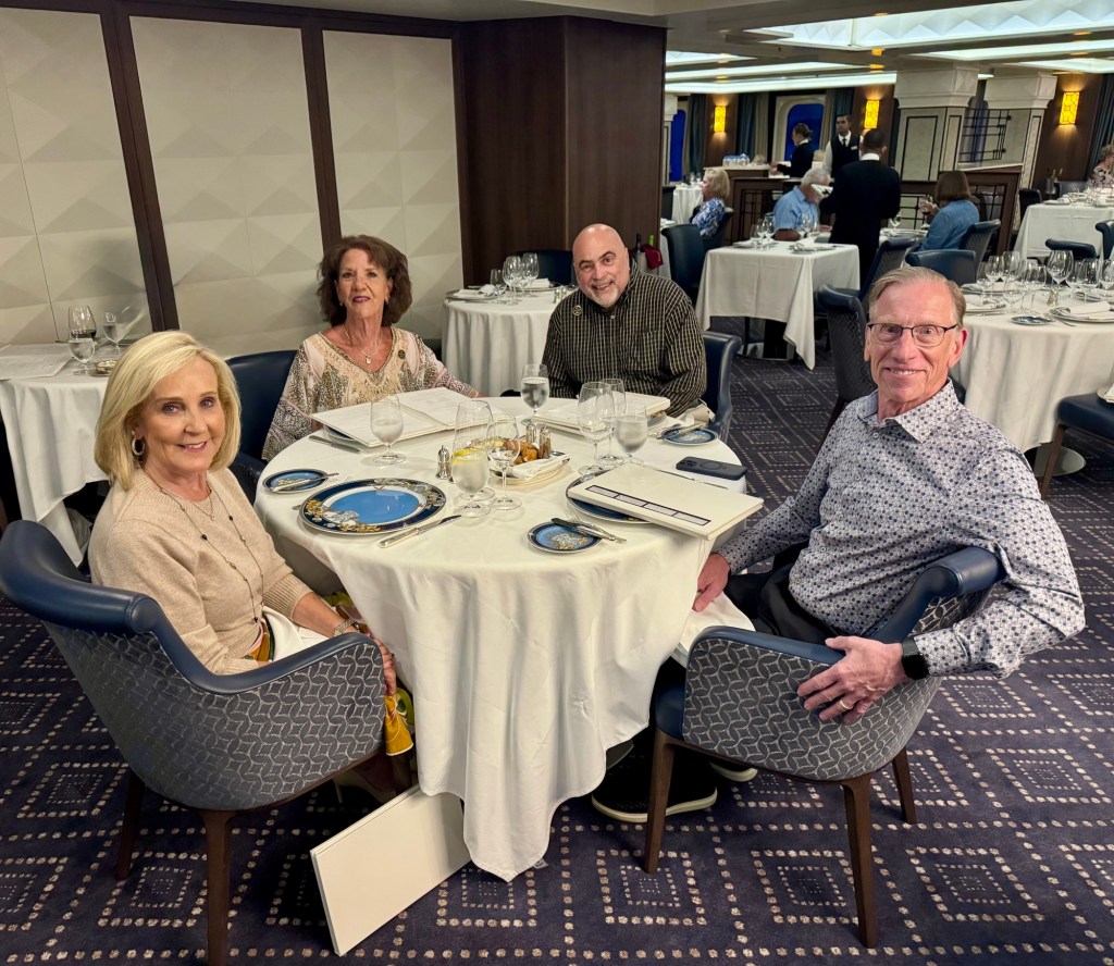 Hi Again All! We had another fantastic night on the Mariner. We started the evening having dinner in Compass Rose with our good friends Colleen and Steve. I always say we may not have done this world cruise if it wasn’t for them.