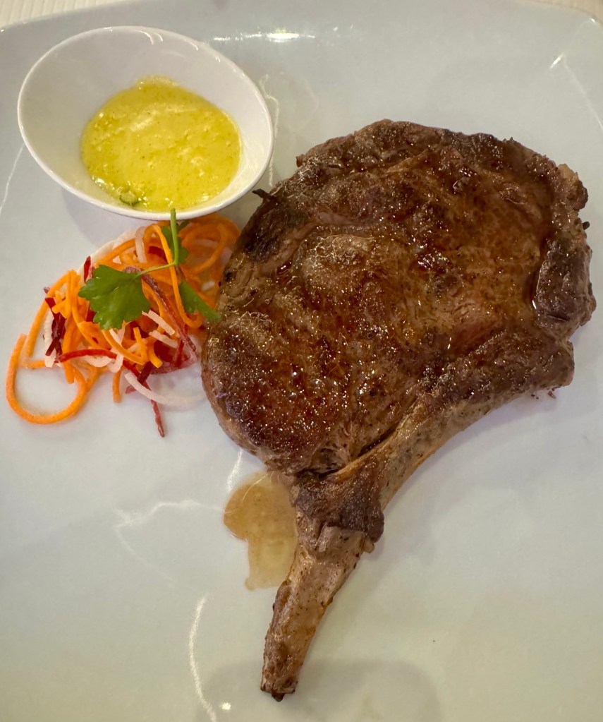 We started off by having dinner in the best Specialty Steakhouse on the high seas, bar none. We had dinner in Prime 7 and strapped the feedback on! I thought I’d try something different but keep going back to my favorites. I had the Seared Diver Scallop for my appetizer and the Bone-In Ribeye for my main. Gotta get my iron levels up! But I skipped dessert. Shameful (but stuffed!).