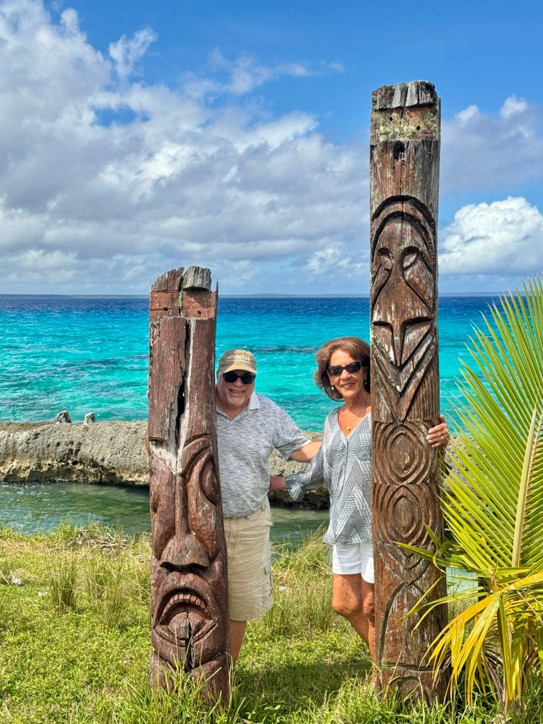 Our excursion today was called “Melanesian Encounter”. Our first stop was at a lookout area called Sandalwood Bay. They had several totem pole type relics there and we could see our boat anchored offshore.