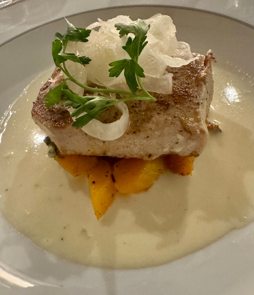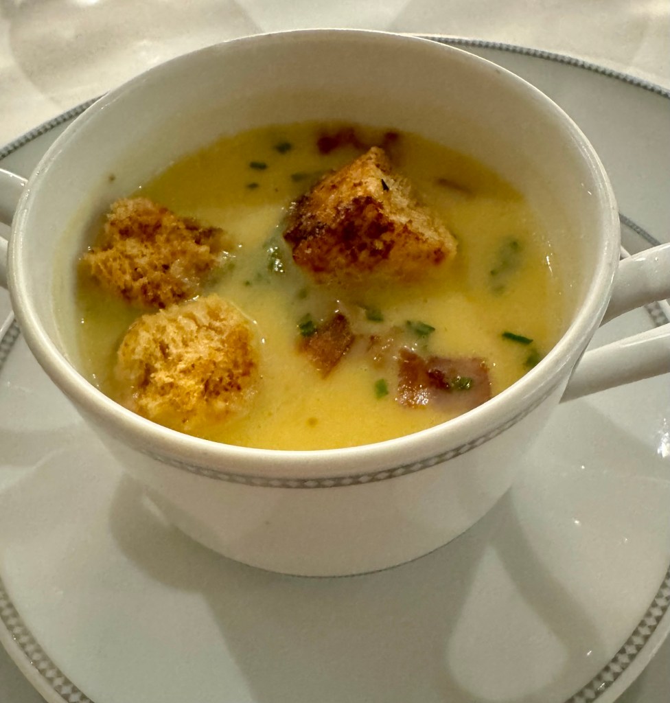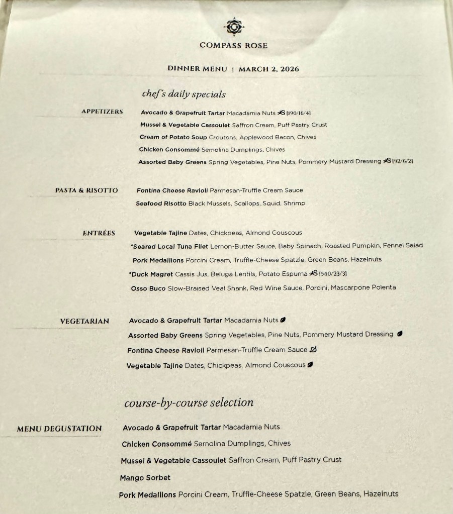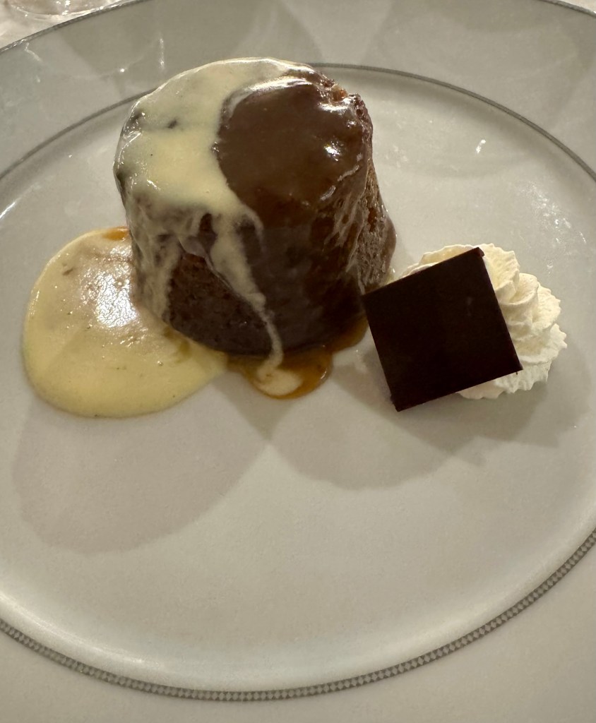 Hi Again All! Wash, rinse and repeat… another great night on Regent. We started with an amazing meal at Compass Rose. I had the Cream of Potato Soup for my starter, the Tuna Filet for my main and Kathy’s favorite, the Sticky Date Toffee Pudding, for my dessert. All were outstanding!