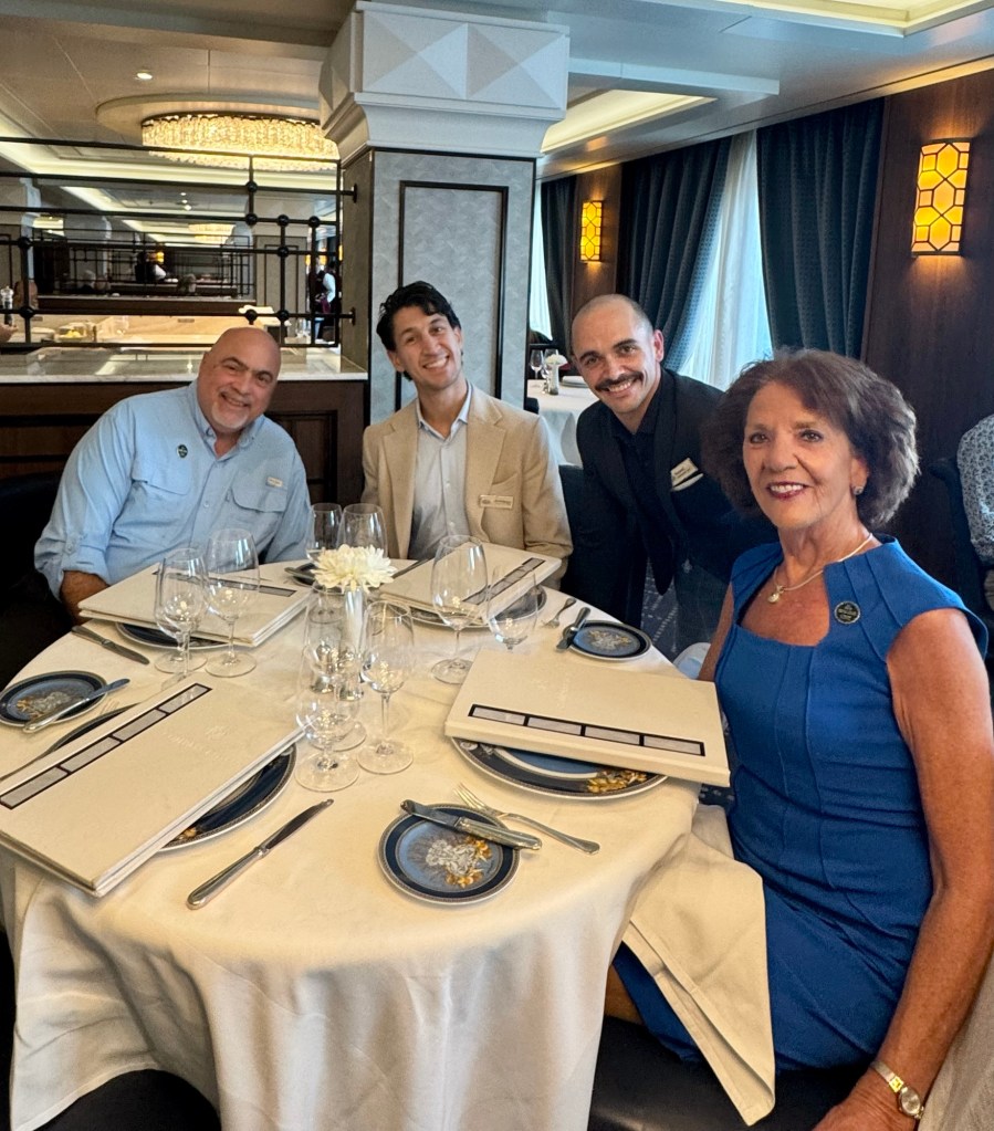 We then had dinner in Compass Rose with two of the Regent singers. Russell, a singer/dancer from London, has done Bye Bye Birdie, 42nd Street, and Sleeping Beauty, among others. Emmanuelle (who goes by Em) is a dancer from Argentina. He has done many famous ballets and has danced on various different cruise lines. They are both great people!