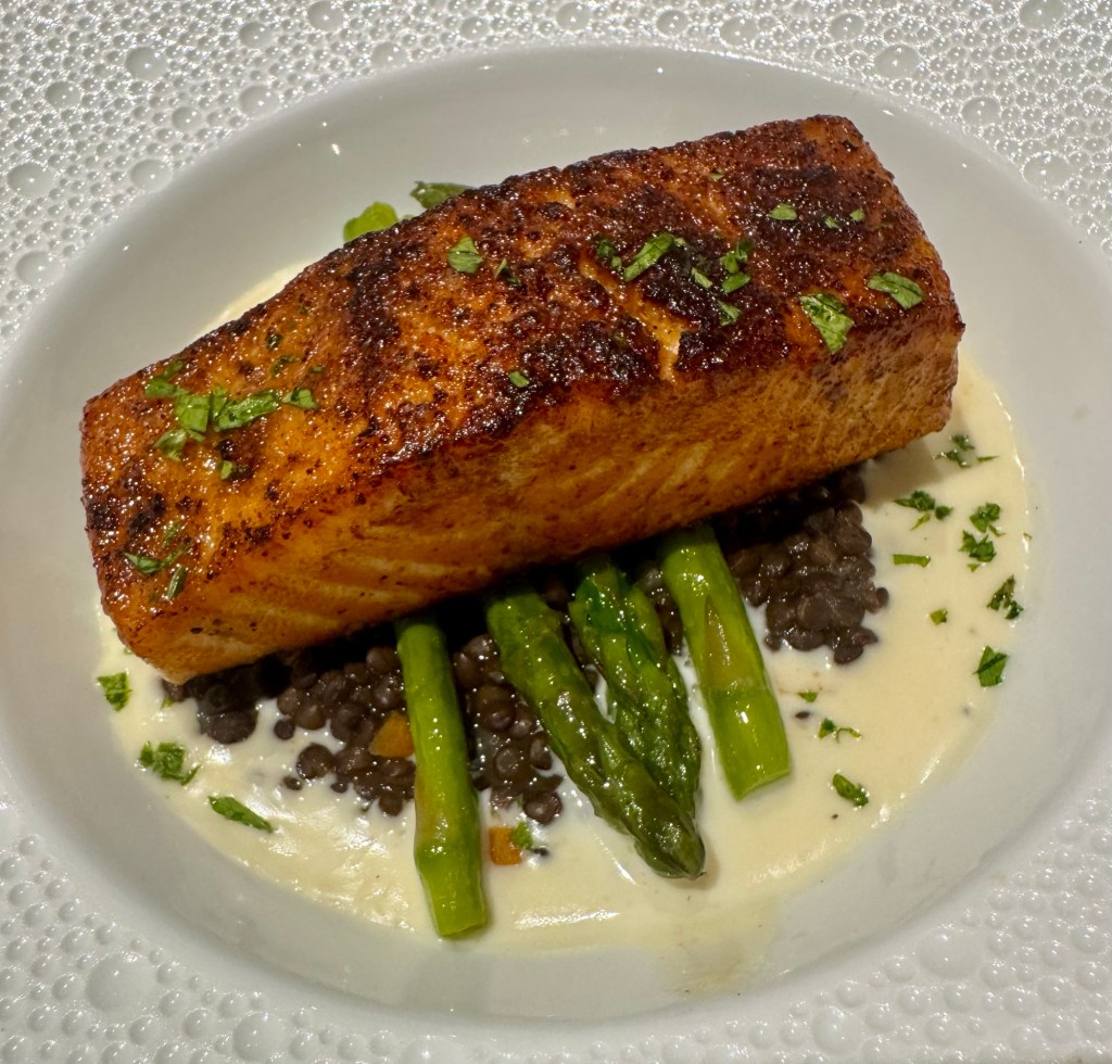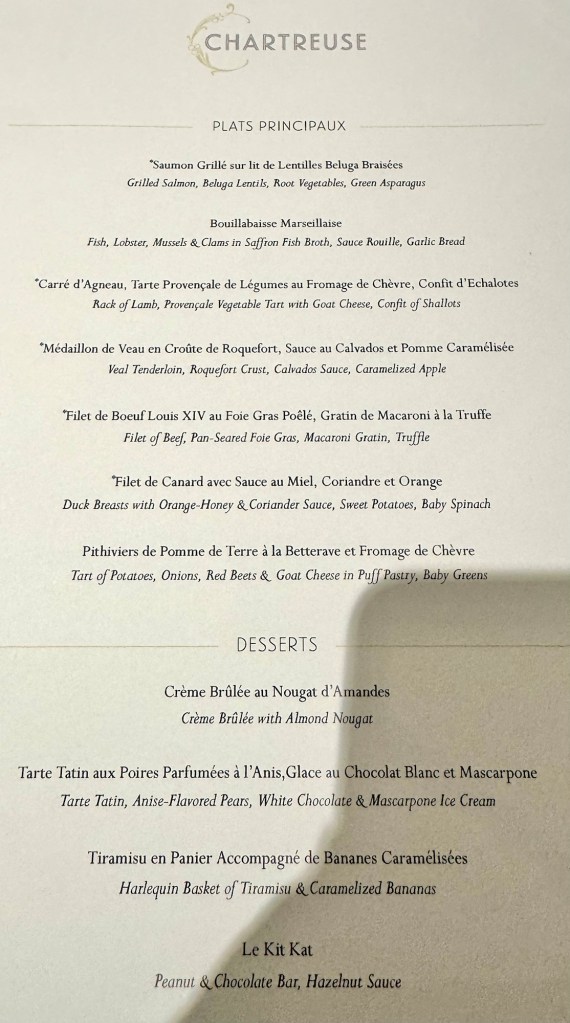 After that we had dinner in Chartreuse, the French themed restaurant. I shouldn’t but I always eat big at the specialty restaurants (but I skipped dessert so that helped a little!). I had three appetizers (yes I did!). The Lobster Medallions, the Escargot and the Cream of Mussels Soup. For my main I had the Grilled Salmon. “C’etait delicieux”! (It was all delicious!).