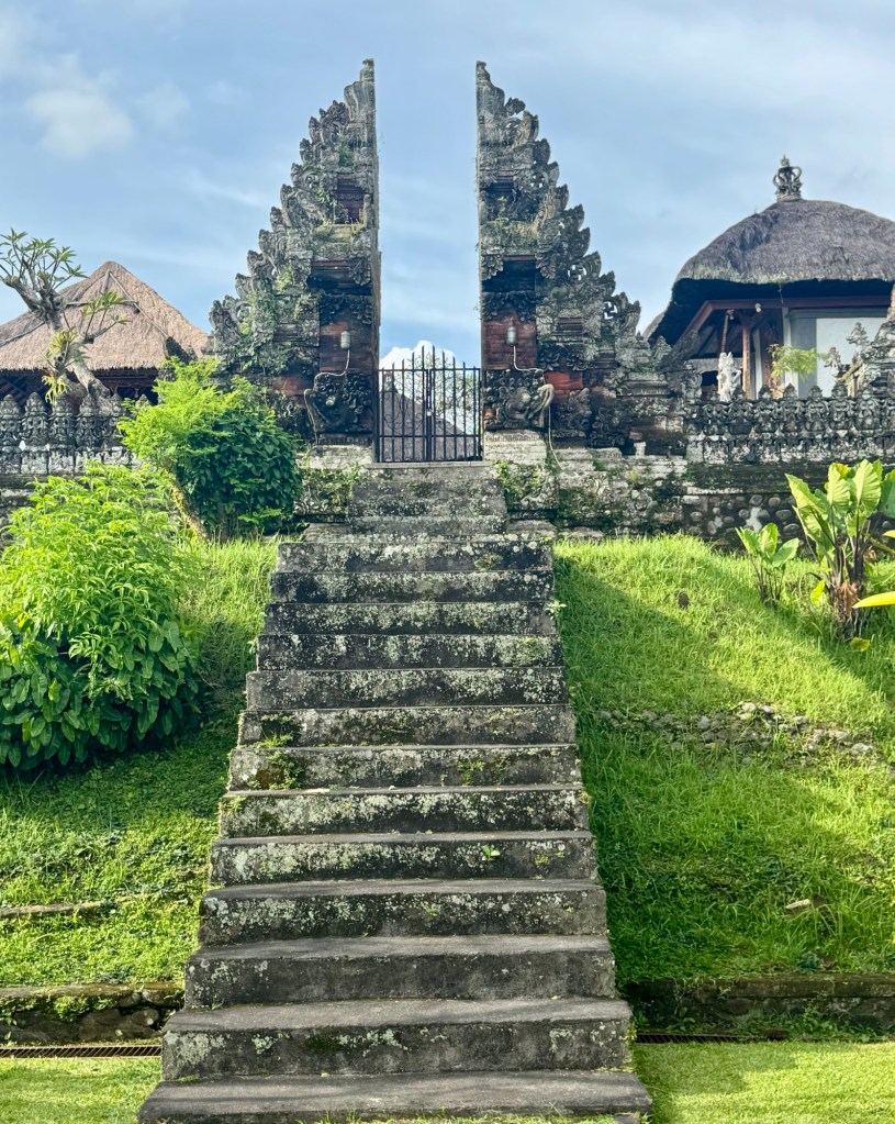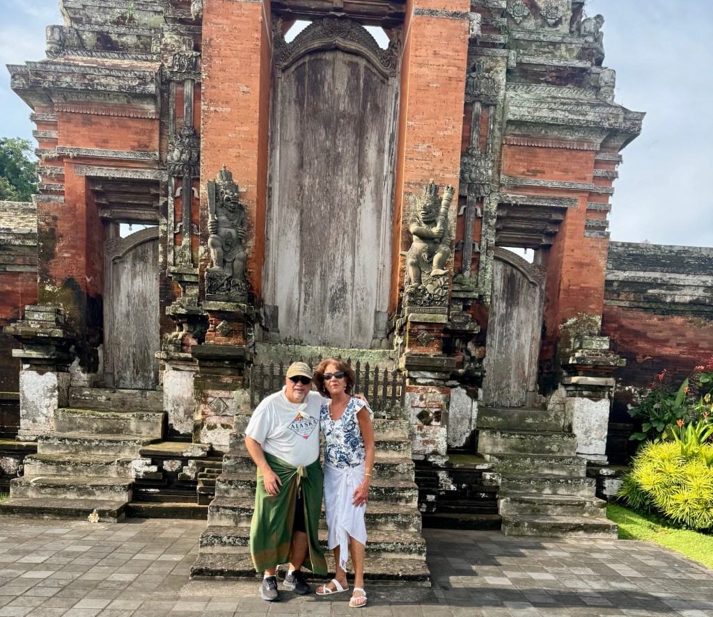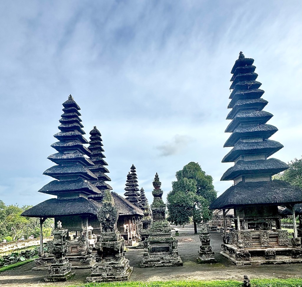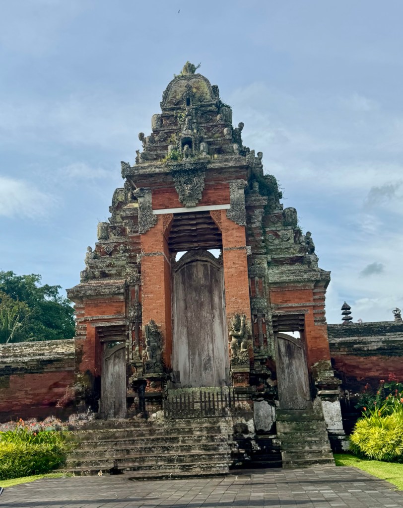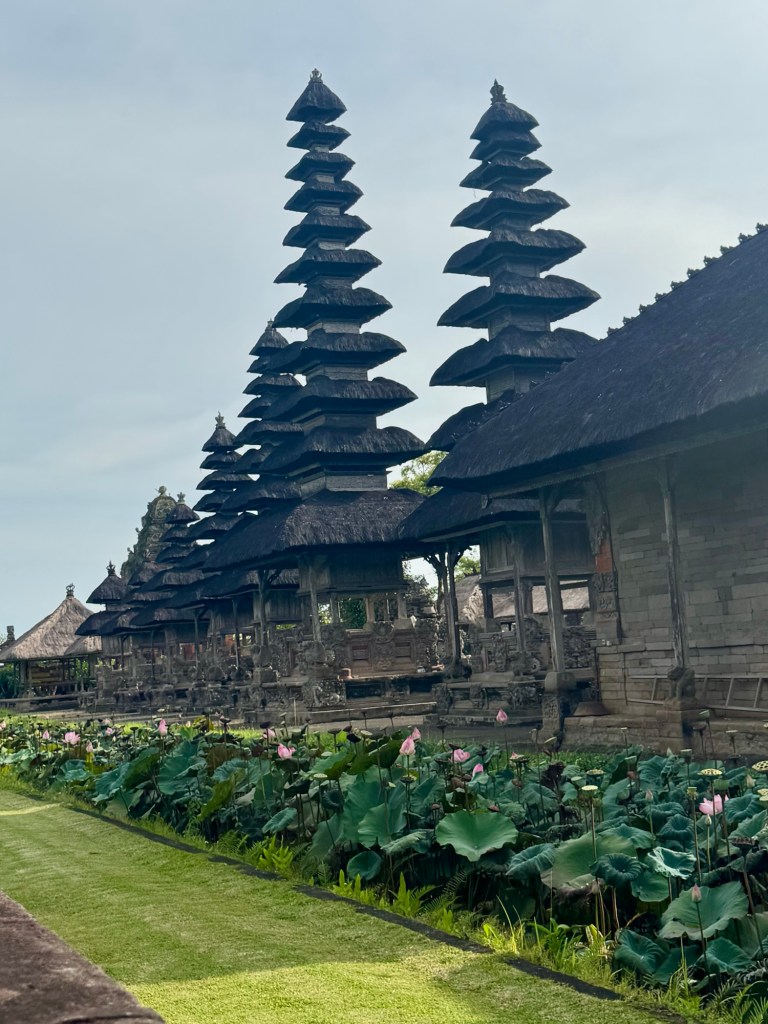 Our next stop, Taman Ayun Temple, was also amazing. It’s a compound that includes both a Royal Balinese temple of the Mengwi Empire and a beautiful garden. It was first built in the 17th century as a family temple for the Mengwi Royal Family. The garden portion has lots of water lilies in the water. And yes, they made me wear a sarong to cover my legs! That’s why I look so dorky in the pic!
