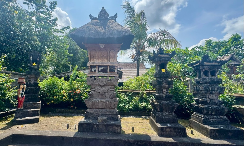A Balinese House Compound, in essence, is a cluster of buildings enclosed behind a wall that all generations of a family live in together. In Bali, houses and land are passed down from generation to generation. Each compound has its own temple within the walls.