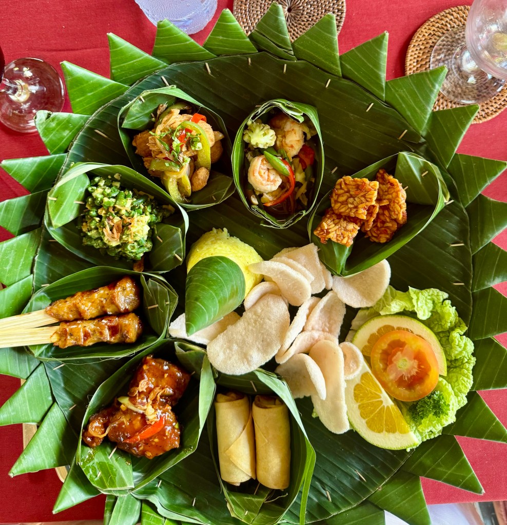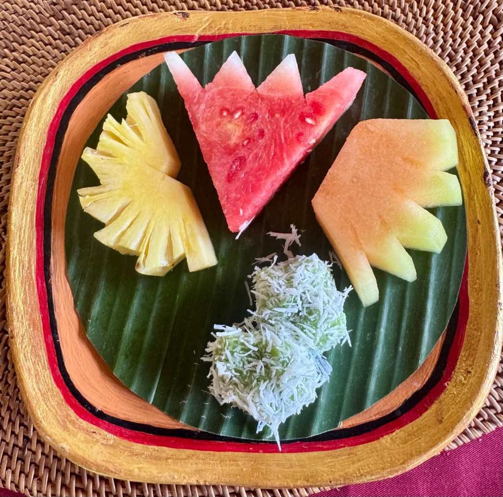 We then had this amazing lunch! They gave us 10 different items all displayed so beautifully on banana leaves. It was like a work of art and so yummy. There was chicken, rice, shrimp crackers, egg rolls and more. It looked so good I didn’t want to eat it (but I did!). They also gave us dessert of fruit and these little coconut covered brown sugar treats. Sooo tasty!