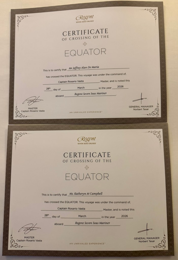 Of course being a sea day we played lots of passenger games such as Skittles, Axe Throwing and Name That Tune. We won 10 Regent points! But they did not have an Officers Challenge or we would have won more! Also, we did cross back over the equator and are now back in the Northern Hemisphere. We got another certificate for it!
