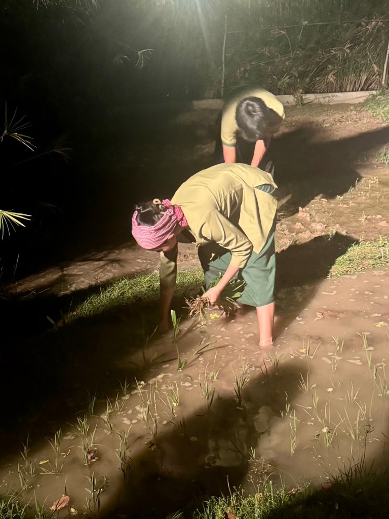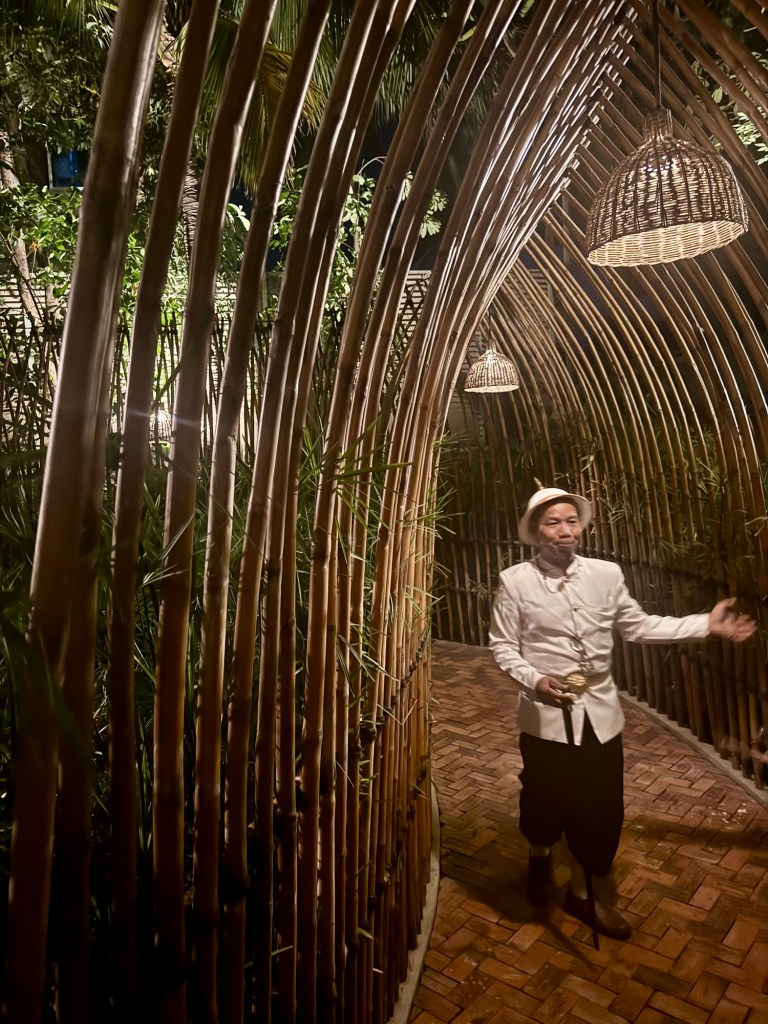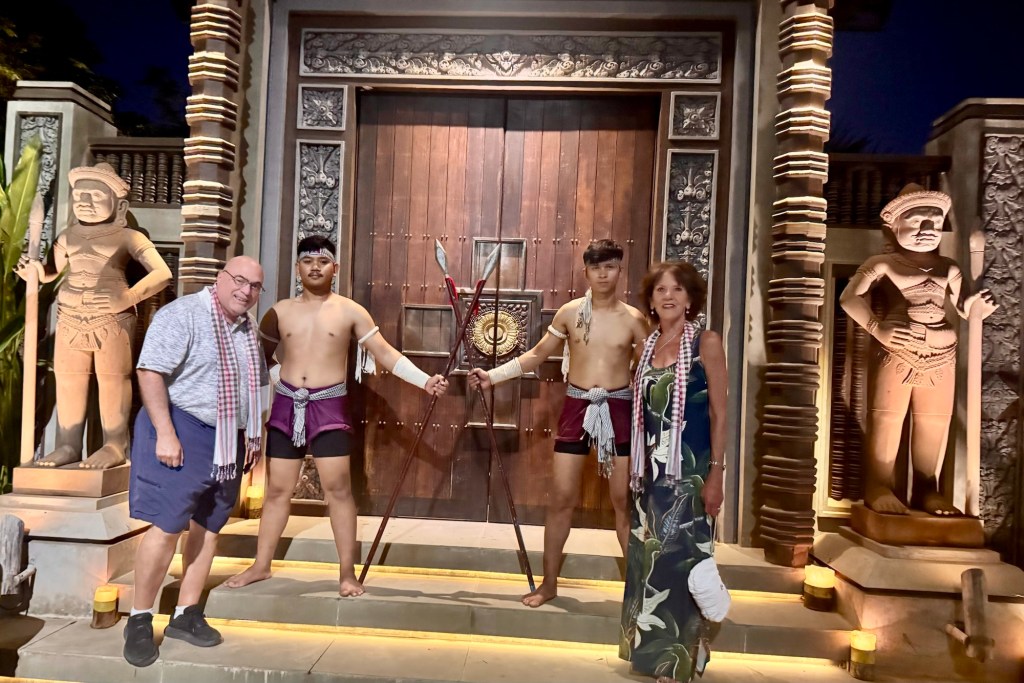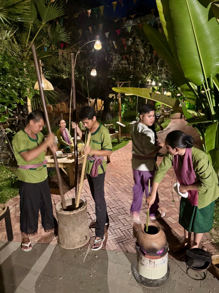 Hi Again Gang! On these Regent sponsored overland tours, they treat us just as nice as Regent. Our guide met us all in the lobby at 6:45 PM and we took the bus to an open air hotel to watch a group of people simulate various Cambodian chores. When we got there we got another welcoming gift of a Krama scarf! (Anybody want one??? Lol).