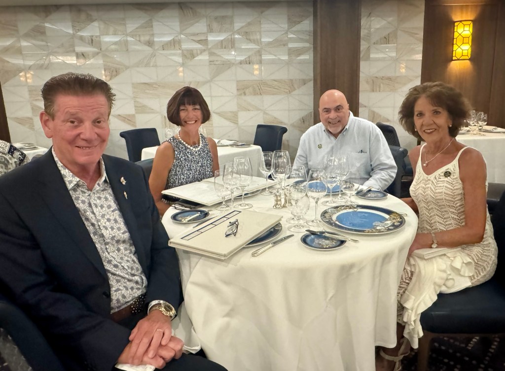 Hi Again Gang! You know it’s so nice when you’re cruising and you meet great people. Well we had dinner with those great people tonight. If you remember a few weeks ago, I told you about a woman who came to our dinner table and knew Kathy and I from my blog. And then they invited us to their suite for happy hour. Remember them?