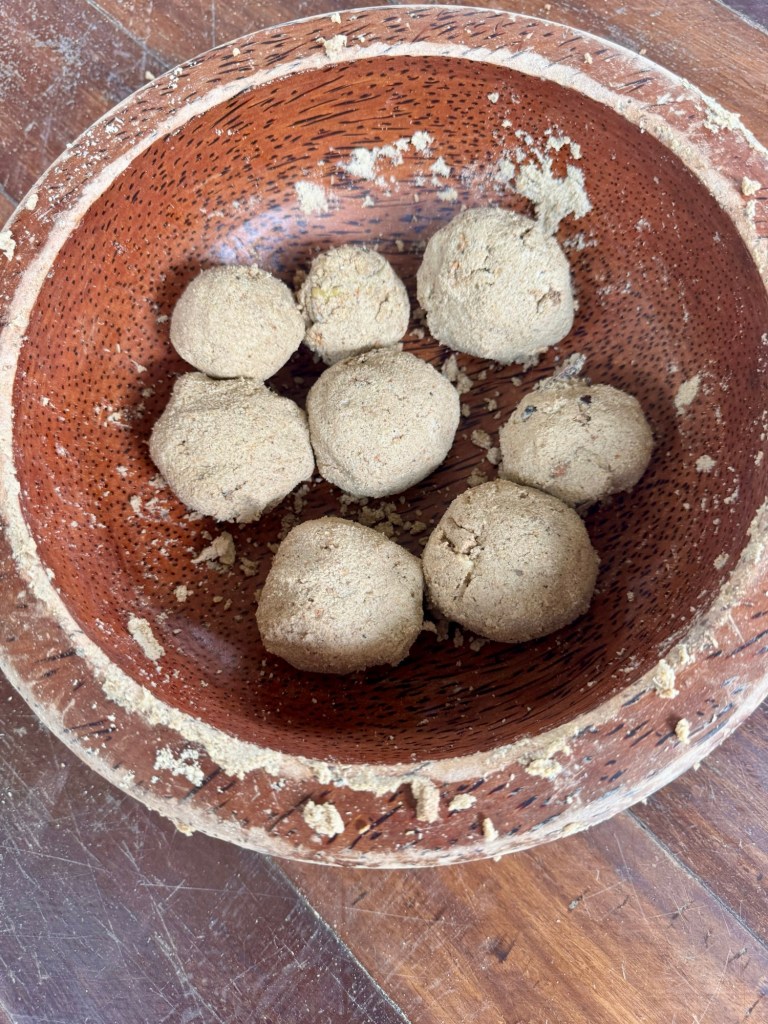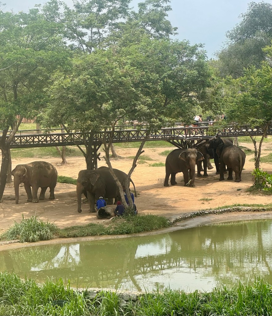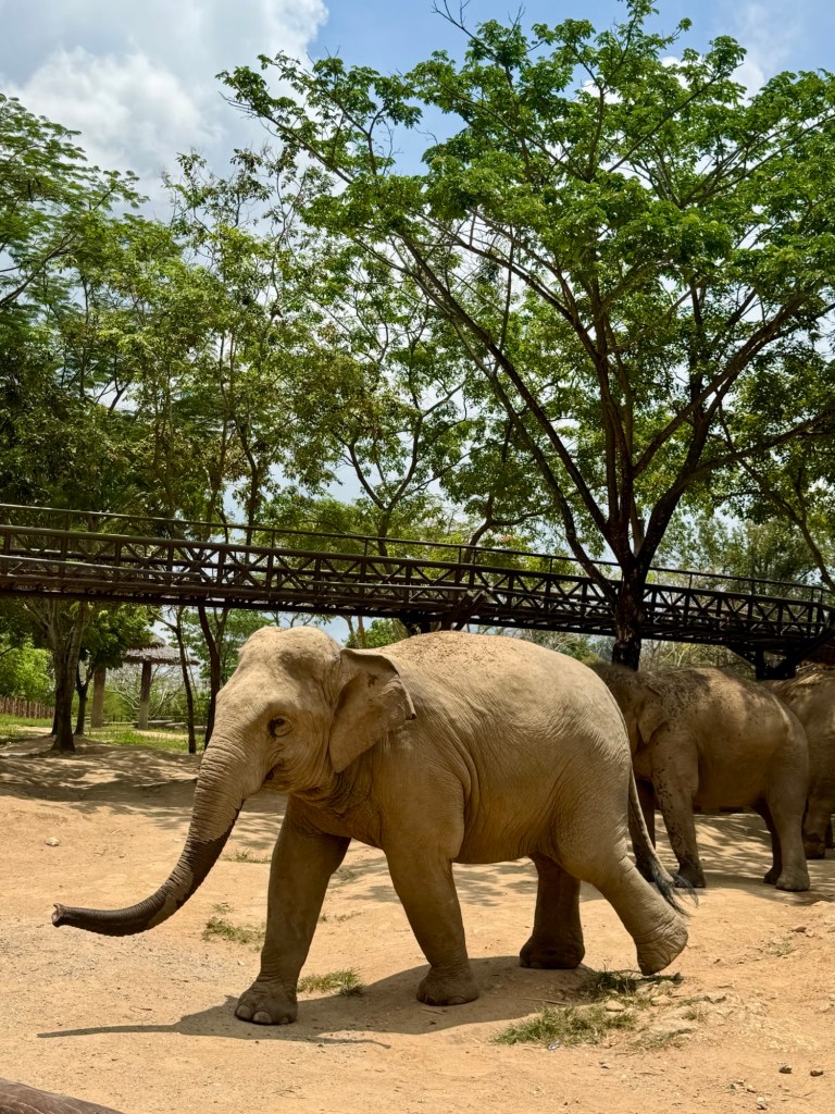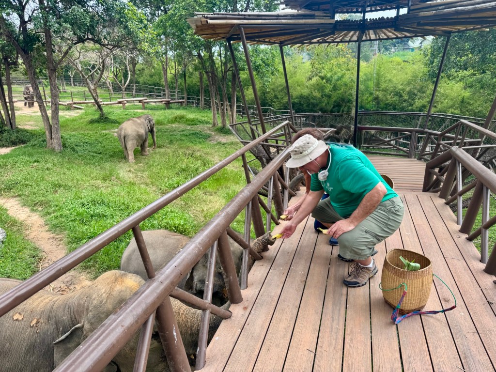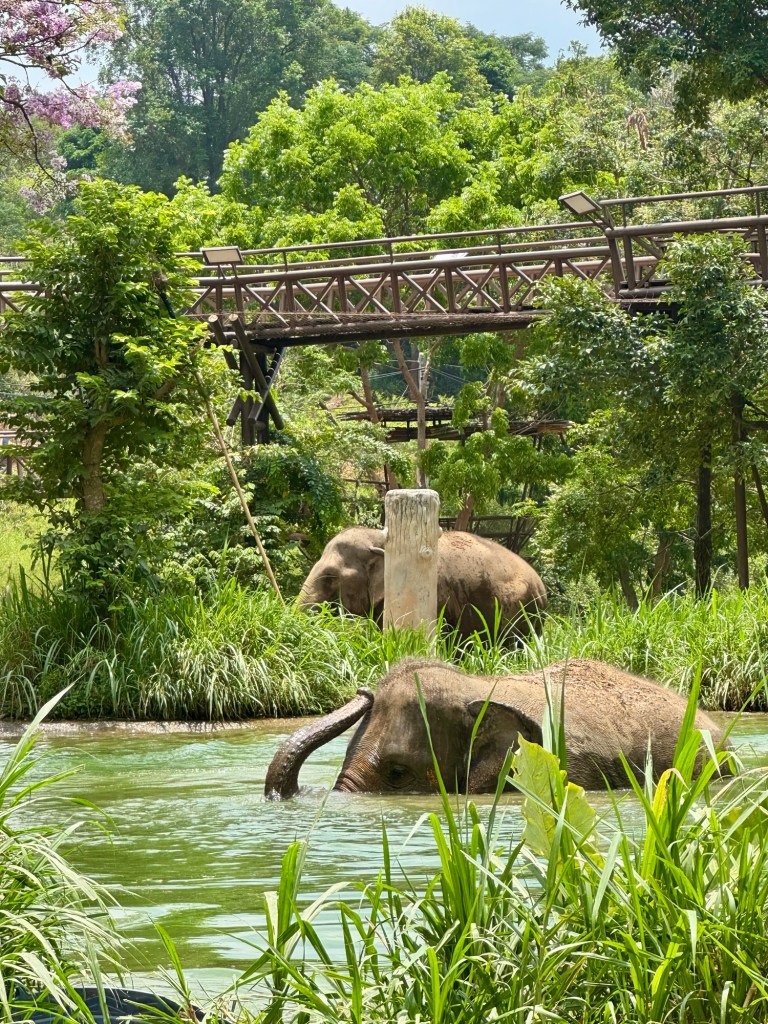When we got there, we first made “vitamin meatballs” for the elephants and oh were they excited to see us and eat the meatballs. After that they gave us all baskets full of treats we could use to feed the elephants from the overhead walkway. The baskets had a mixture of palm leaves, sugar cane sticks and bananas (which they like the best and the guide said they’re like chocolate to them!).