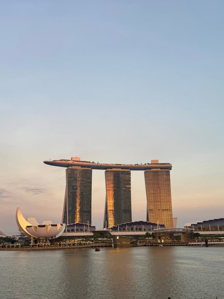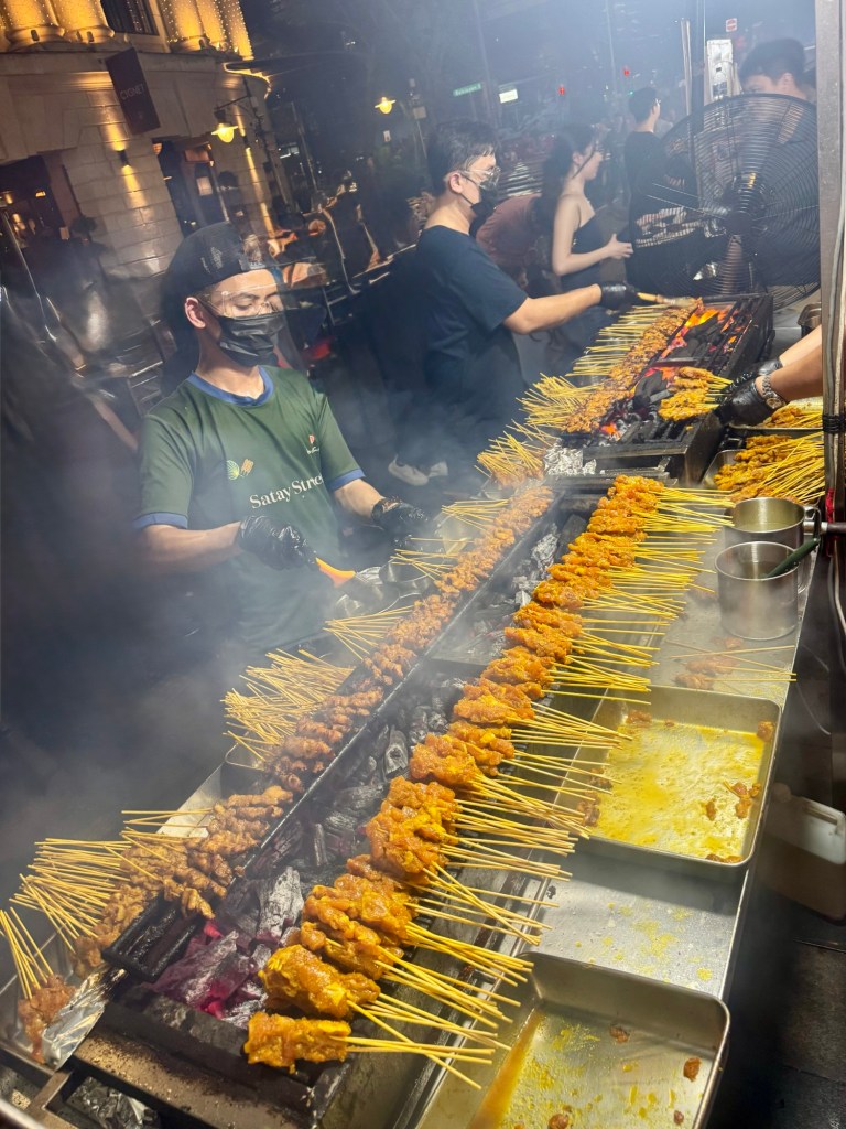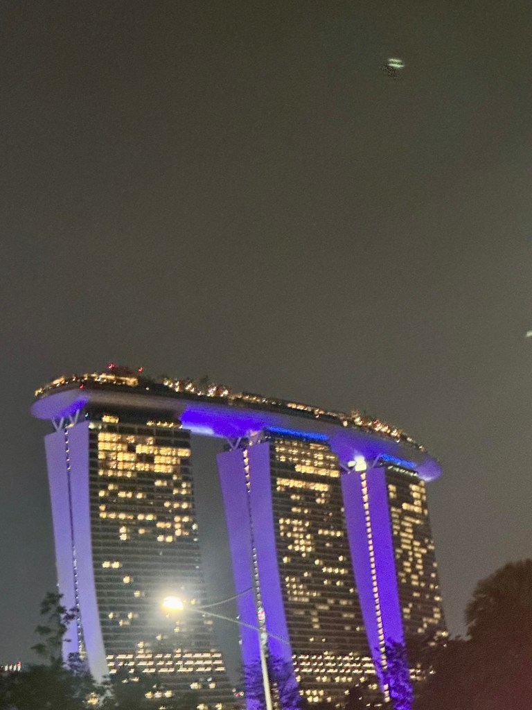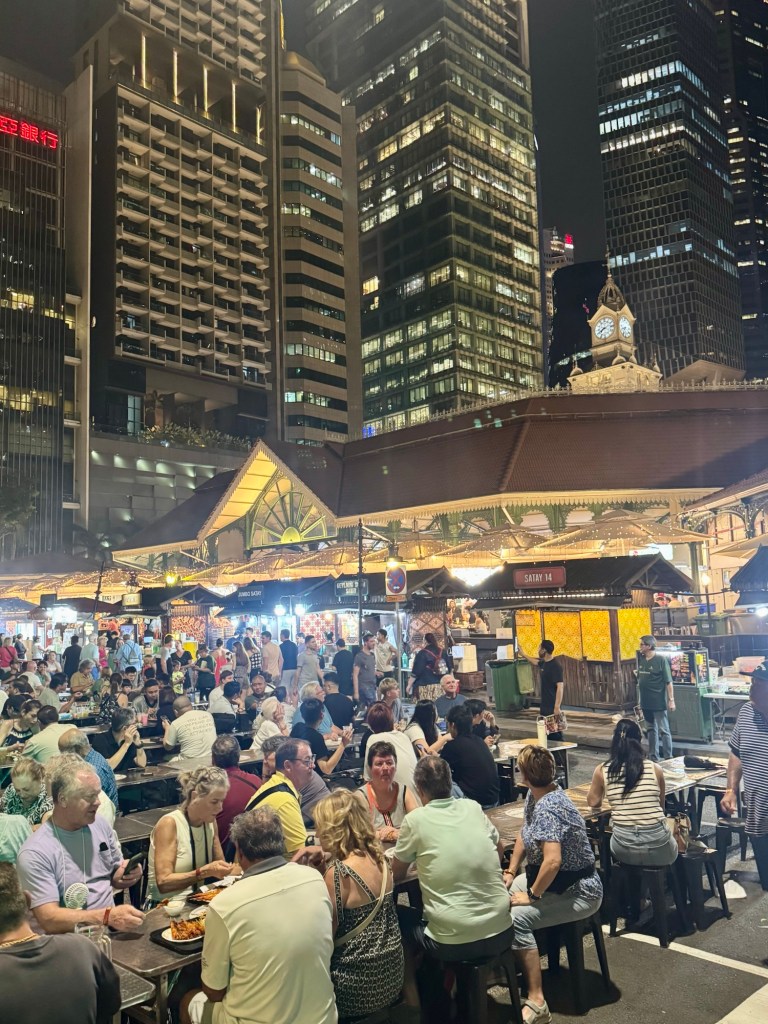 Hi Again Folks! WOW! I thought Singapore was a cool city during the day. At night it just explodes with color! Our evening tour was called “Singapore Magical Night Tour”. We rode on the upper deck of a bus to various spots around the city. We started at the Lau Pa Sat Night Market to sample their famous chicken satay (chicken on a stick with peanut sauce). It was delicious!