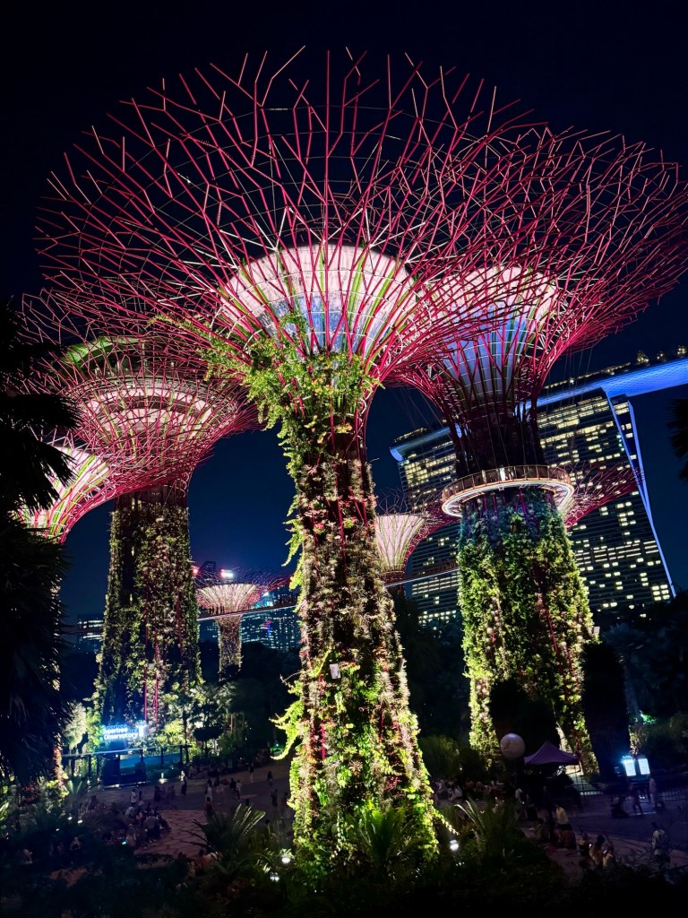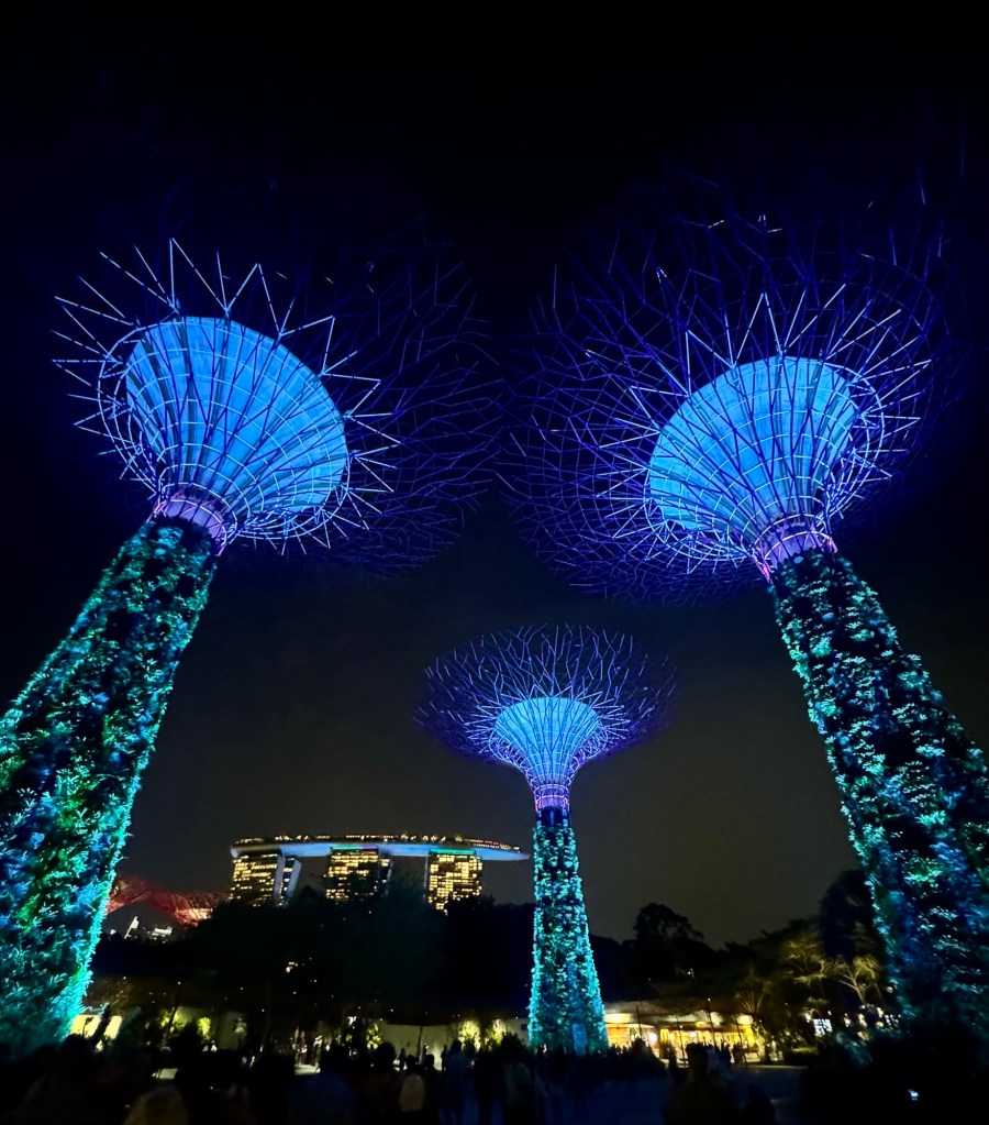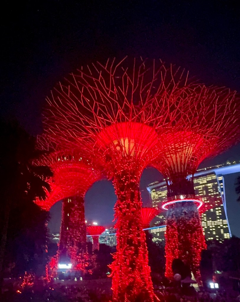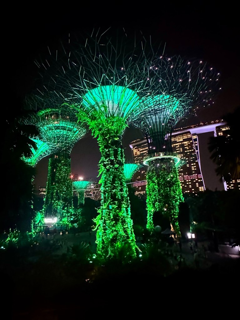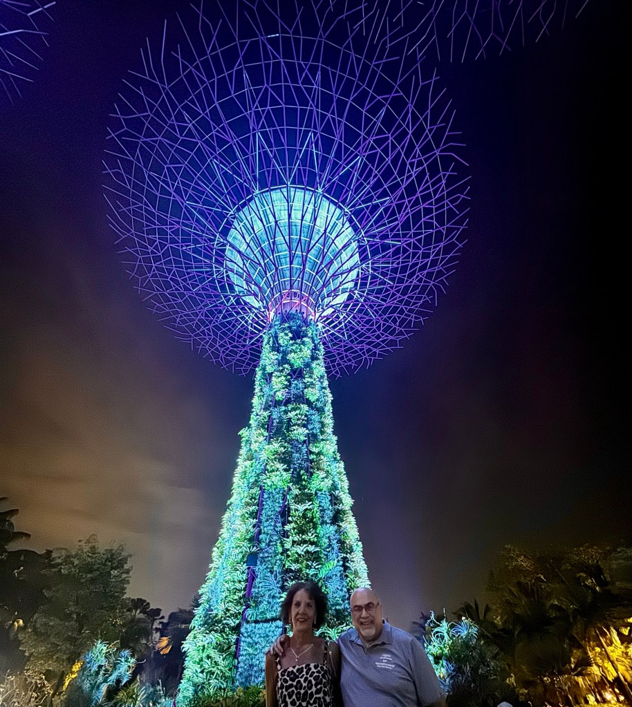 We then went to Gardens By The Bay for the spectacular Super-tree Grove light and sound show. That was truly amazing! These 6 huge “trees” (165 feet high) feature solar panels, rainwater collectors and over 160,000 plants. Every night at 7:45 and 8:45 PM, there’s a free light show with music. It was really cool!