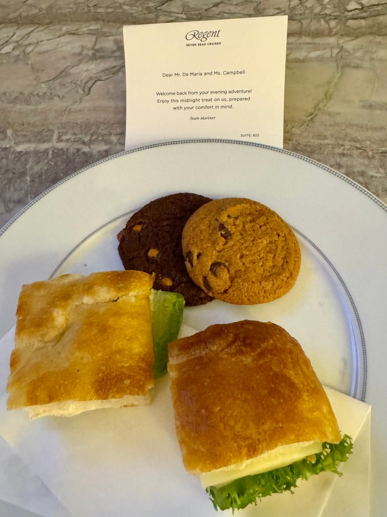 PS: I’ve told you how Regent treats you like family… when we got back from our tour, they had left us a Midnight snack with a note. Nice touch!