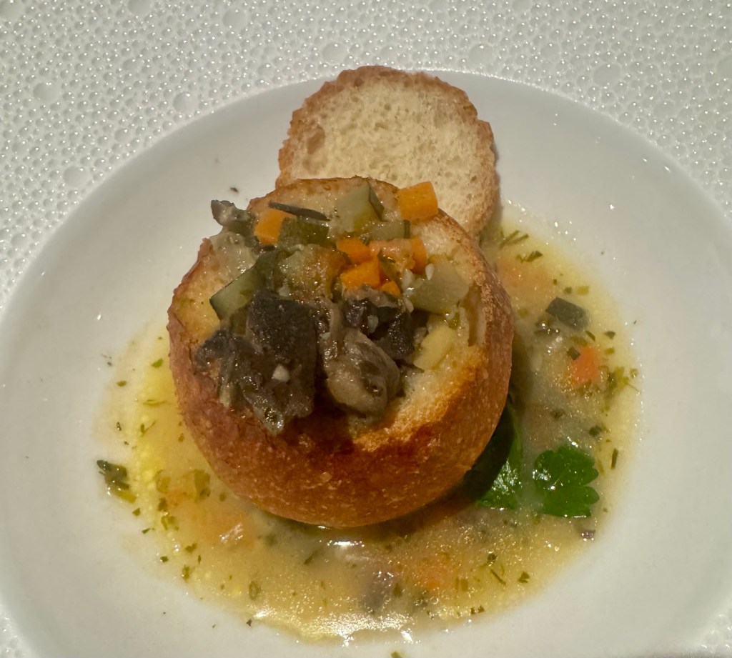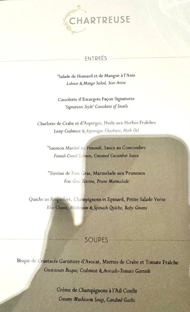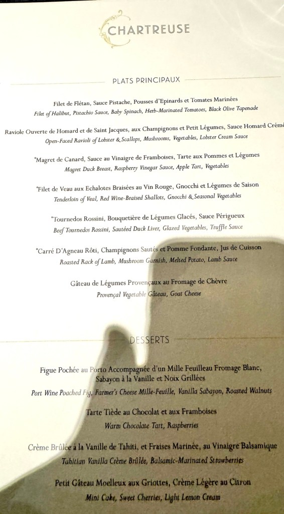It’s funny, in the past Chartreuse was not always our favorite restaurant venue but we now like it very much. For dinner I had both the Escargot and the Mushroom Soup for my appetizers. For my main I had the Filet of Halibut and for dessert I had the Tahitian Vanilla Creme Brûlée. Everything was excellent and I finally included some food pics (with approval from Colleen! Lol).