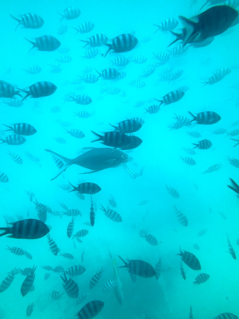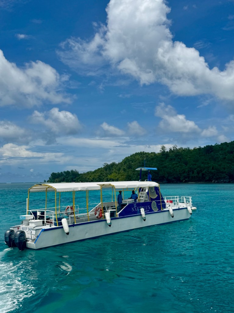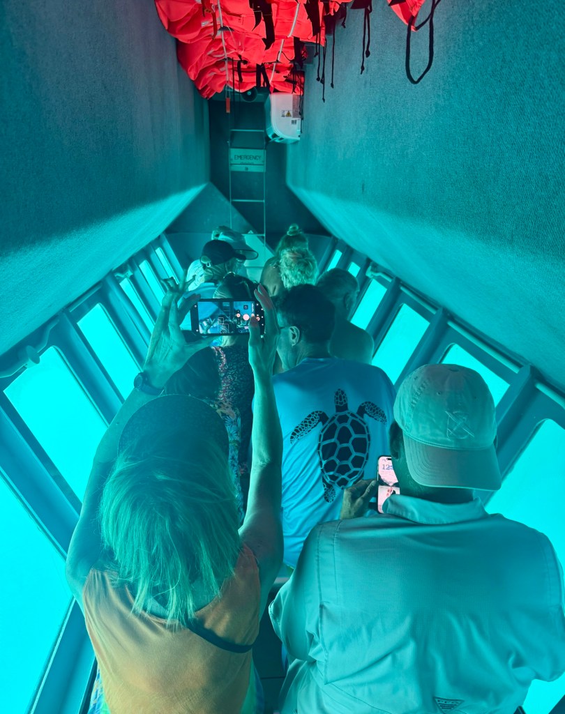 So we got lucky and were able to get on a later snorkel trip at 11:50 AM. We boarded a catamaran at the pier and sailed to the Marine Park. We then boarded a semi-submersible (think submarine) to view lots of marine life. It was like snorkeling but sitting in an air conditioned ship. (It helped that they were feeding the fish! Lol).